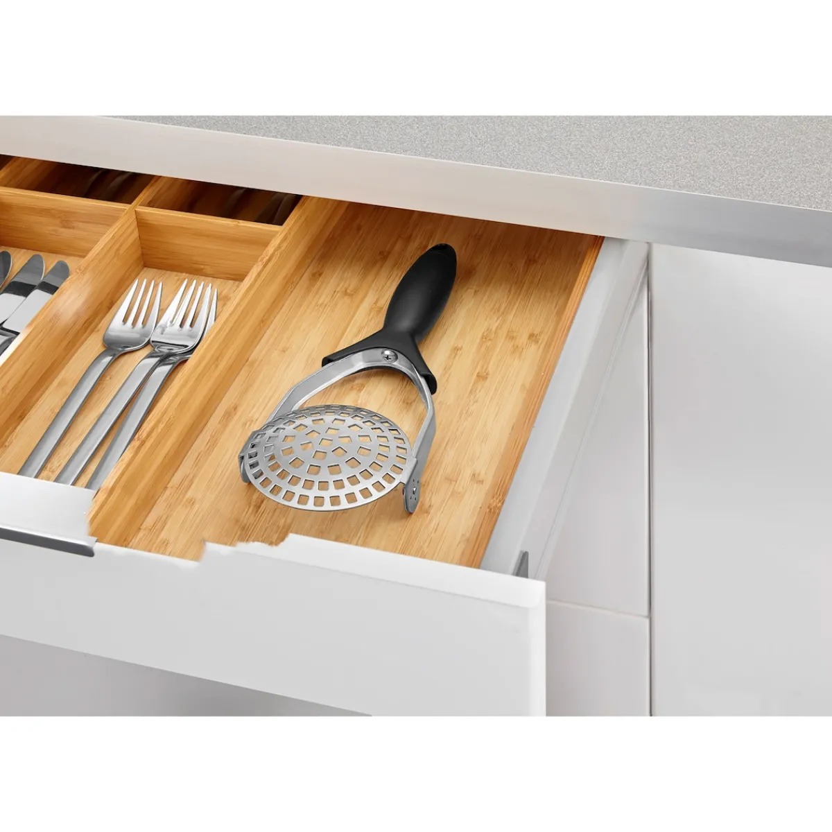 Trotz seines kompakten Maßes nimmt es dieser Kartoffelstampfer auch mit großen Kartoffeln locker auf. Der Clou liegt in der Aufbewahrung: Die Stampffläche wird einfach eingeklappt, so dass der Stampfer platzsparend verstaut werden kann. Spülmaschinengeeignet.