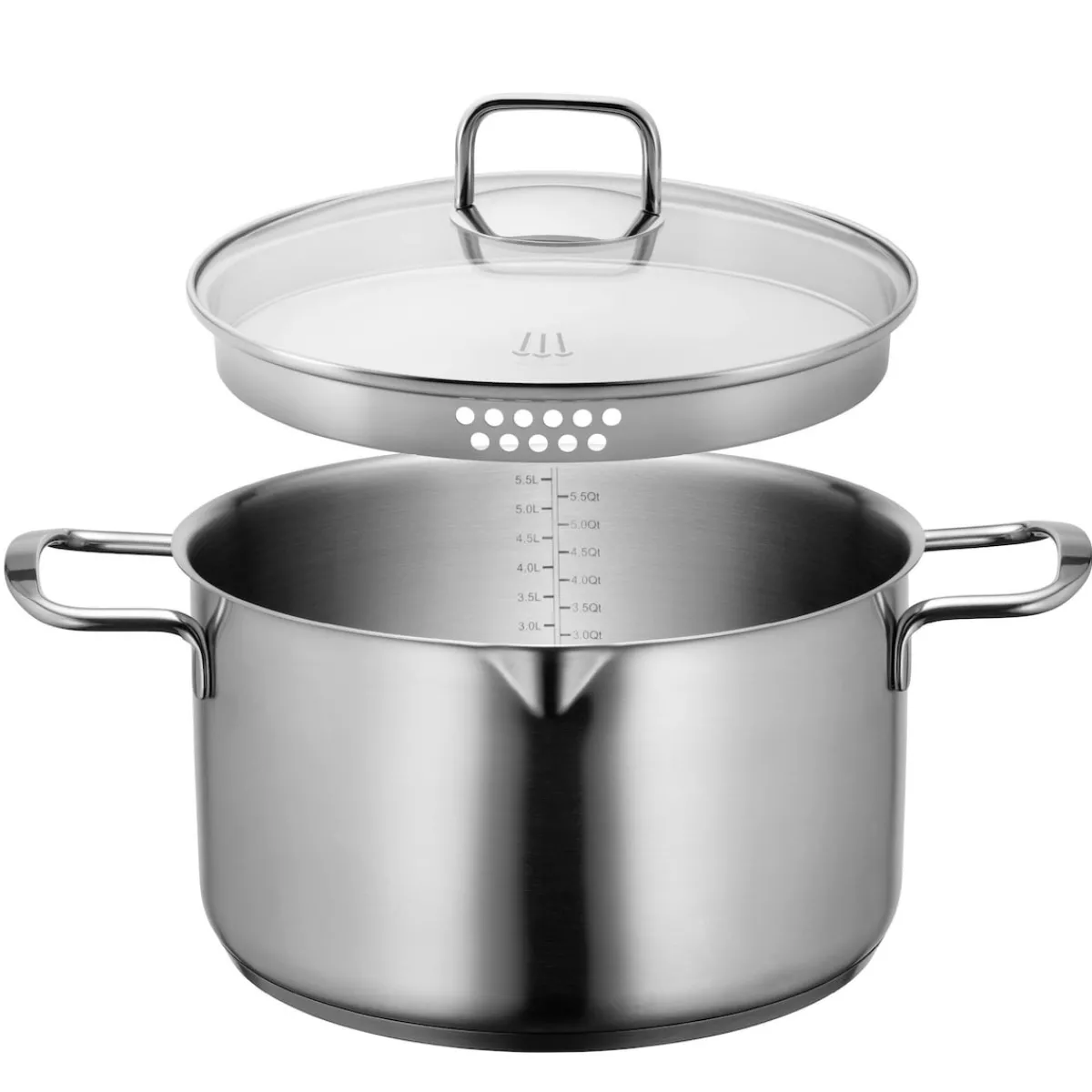Kochen mit hochwertigem und vor allem gut durchdachtem Kochgeschirr erhöht den Spaßfaktor enorm. Die Kochtopf-Serie Sanvito lässt keine Wünsche offen, wenn es um clevere Kochlösungen auf dem Herd geht. Die Edelstahltöpfe haben einen praktischen Ausgießer und eine Literskala. Garflüssigkeit abmessen vor Kochbeginn und abseihen nach Ende des Kochvorgangs sind damit ganz ohne weitere Hilfsmittel möglich. Durch den robusten Glasdeckel können Sie zu jeder Zeit beobachten, was im Topfinnern passiert.