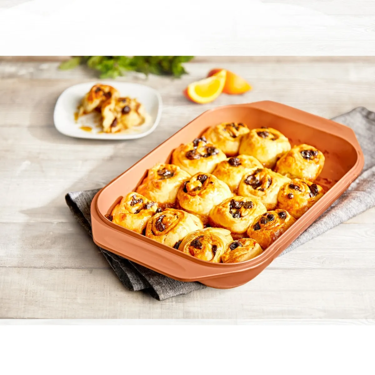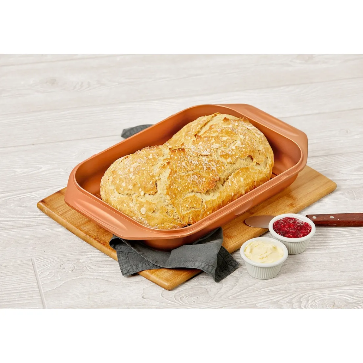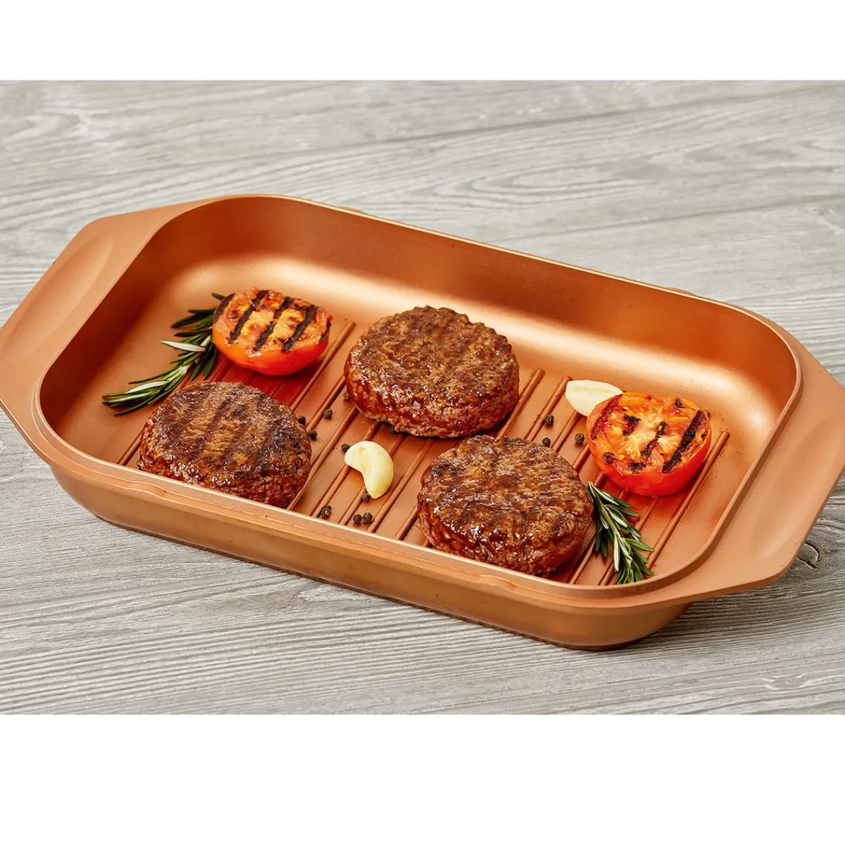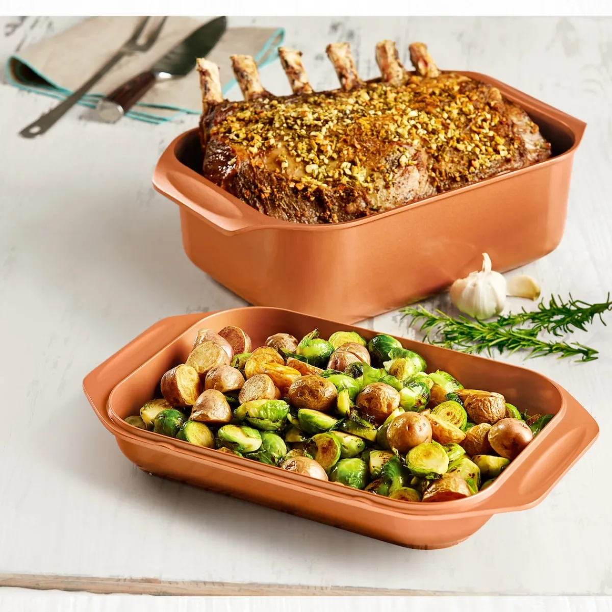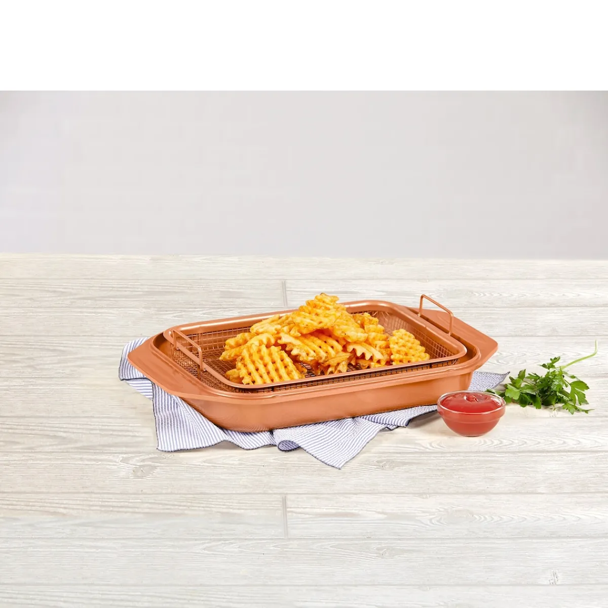 Braten Sie einen Truthahn im hohen Bräter, setzen Sie den flachen Bräter auf und schmoren Sie saftige Rippchen. Oder wie wär’s mit heißluftfrittierten Pommes – einfach Copper Crisper in den Backofen und los geht’s!