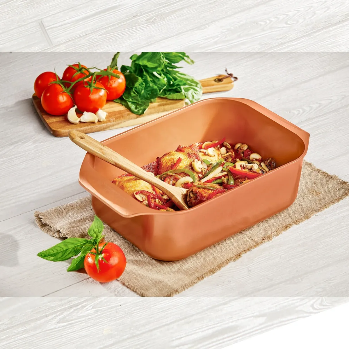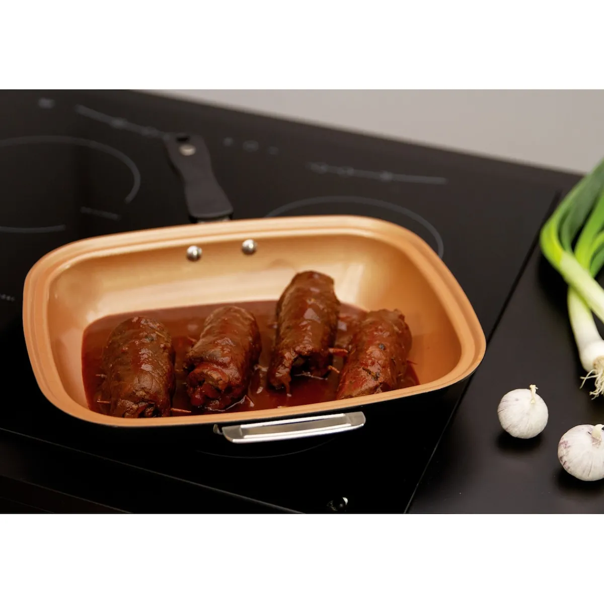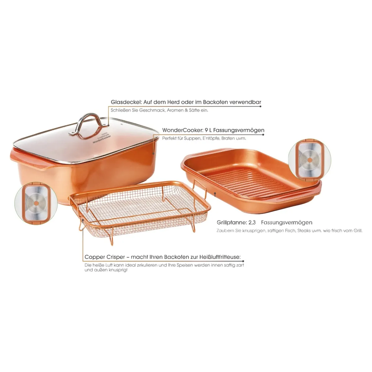 Verwenden Sie dieses 14-in-1 Kochwunder als Bräter, Dutch Oven, Suppentopf, Bratpfanne, Doppelkochgeschirr, Auflaufform, Heißluftfritteuse, Slow Cooker, Dampfgarer, Schmortopf, Kasserolle, Warmhalteschale, Backform oder Grillpfanne! Auch in der Anwendung sind Ihnen keine Grenzen gesetzt – ob am Herd, im Backofen oder auf dem Grill – mit Livington Copperline WonderCooker liegen Sie immer richtig!