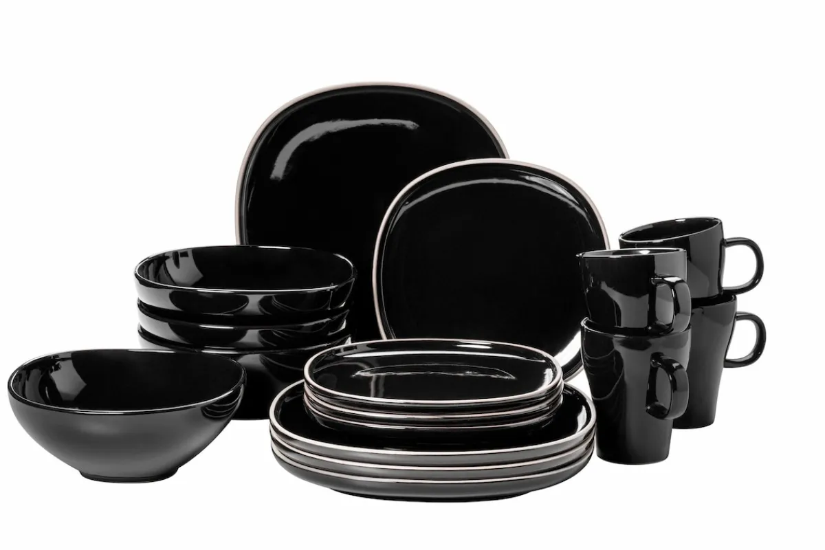 Mit ihrer abgerundeten quadratischen Formgebung präsentiert sich die Keramikgeschirr Kollektion „Isora“ der österreichischen Traditionsmarke MÄSER modern und zeitlos zugleich. Ein pfiffiges Detail der Farbvariante in glänzendem Schwarz ist die unglasierte Umrahmung der Teller und Servierplatten, welche die Spülmaschineneignung selbstverständlich nicht beeinträchtigen. Die Farbvariante in Grau-Weiß hingegen überzeugt mit ihrem sympathischen Kontrast zwischen weißer Innen- und grauer Außenglasur. Gefertigt aus hochwertigem und dickwandigem Steinzeug (nicht zu verwechseln mit dem deutlich poröseren Steingut) wird Ihnen dieses Set aus der Kollektion „Isora“ lange Freude bereiten. Alle Teile der Tafelgeschirr-Serie „Isora“ sind mikrowellen- und geschirrspülergeeignet und sind somit äußerst pflegeleicht. Dieses Set wird in einer vielfach auf Bruchsicherheit getesteten Transportverpackung aus ressourcenschonenden Materialien versendet. Bitte beachten Sie: Um eine objektive Vergleichbarkeit zu gewährleisten, gehen unsere Füllmengenangaben von einer randvollen Befüllung aus.