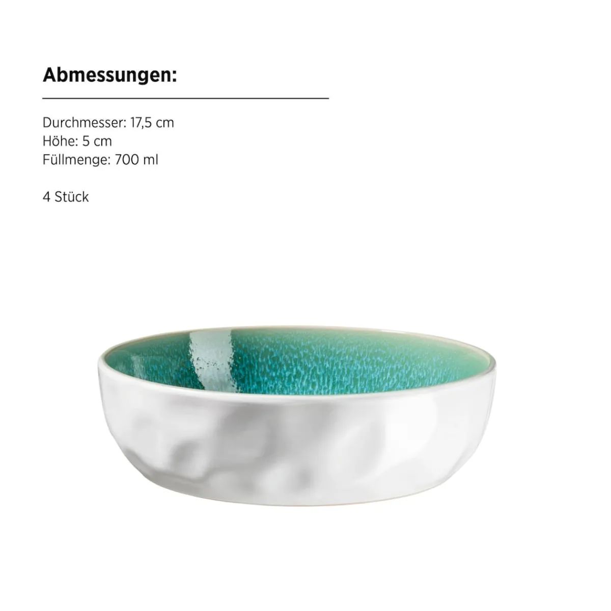 Mit der stilvollen Serie ELEA bringen Sie modernes, harmonisches Flair auf Ihren Esstisch. Die Außenseite in weißer Hammerschlagoptik bildet einen spannenden Kontrast zur türkisfarbenen Reaktivglasur im Inneren – jedes Teil erhält so eine einzigartige Handmade-Optik mit Unikatcharakter.