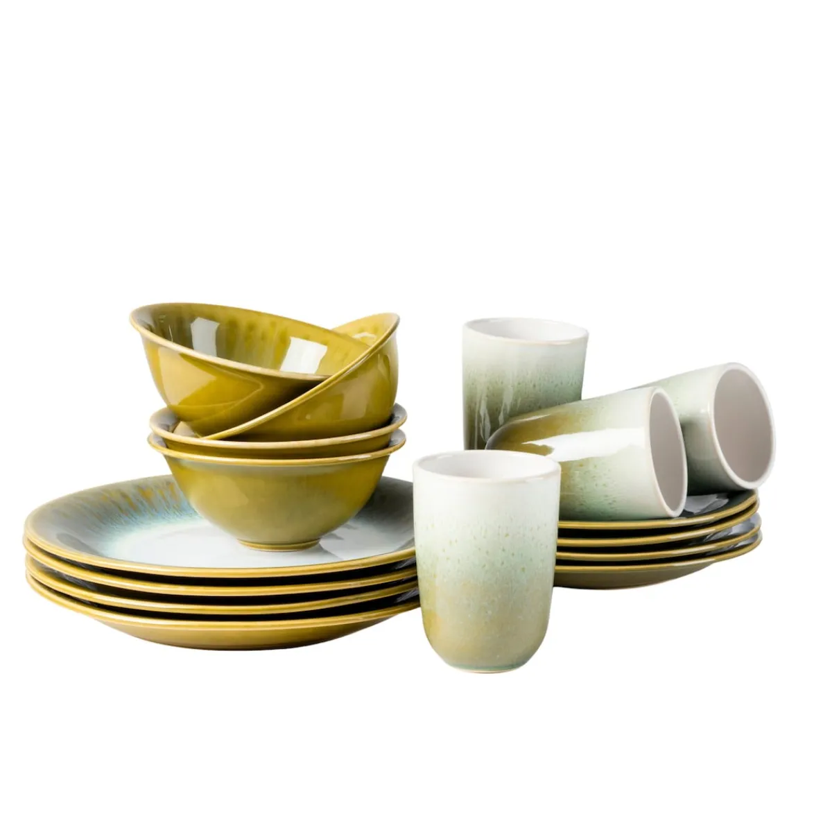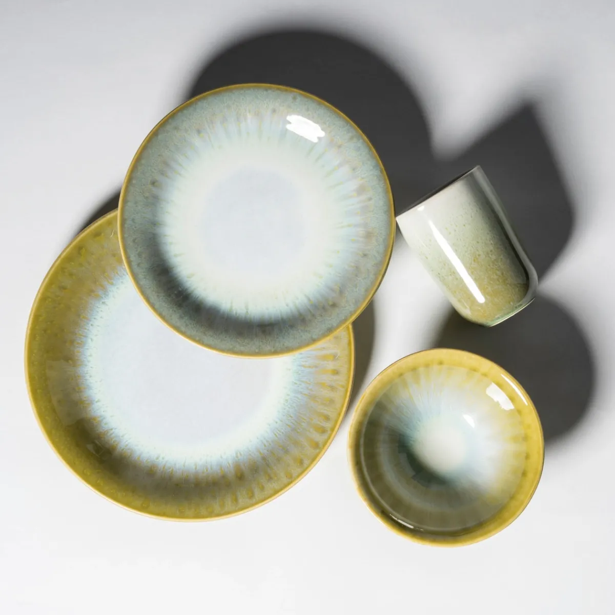 Die Keramik-Geschirr-Serie „Flussufer“ der österreichischen Marke Gipfelstück bringt die Schönheit der Alpen auf Ihren Esstisch. Inspiriert von einem Bergfluss, dessen klares Wasser sich seinen Weg durch grüne Täler und moosbewachsene Steine bahnt, beeindruckt das hochwertige, modern geformte Geschirr-Set durch seinen besonderen Farbverlauf von braun und grün zu blau. Dank der glänzenden, mehrstufig aufgetragenen Reaktivglasur ist jedes Keramikteil ein handgemachtes Einzelstück; aus europäischer Produktion hergestellt in Portugal. Das aus robustem Steinzeug gefertigte, einzigartige Keramikgeschirr ist mikrowellen- und spülmaschinengeeignet und somit auch alltagstauglich und pflegeleicht. Dieses Geschirrset wird klimaneutral in einer auf Bruchsicherheit getesteten Paketversandverpackung aus ressourcenschonenden Materialien versendet. Um eine objektive Vergleichbarkeit zu gewährleisten, gehen unsere Füllmengenangaben von einer randvollen Befüllung aus.