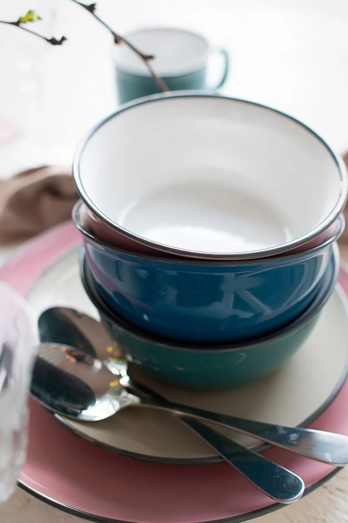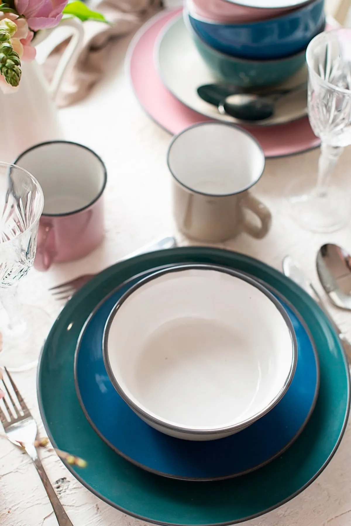 Modern, bunt und rustikal zugleich: Die Keramik-Geschirr-Serie Maila der Marke MÄSER bringt den angesagten Vintage-Look auf Ihren Esstisch. Herbstliche frische Farben und originelle, an traditionelles Emaille-Geschirr angelehnte Formen sorgen für gute Laune, der dunkel abgesetzte Rand zugleich für klare Linien. Je nach Stimmung und Bedarf kombinieren Sie mit Maila die vier sorgfältig aufeinander abgestimmten verfügbaren Farben altrosa, dunkelblau, petrol und beige zu einem harmonischen Ensemble.