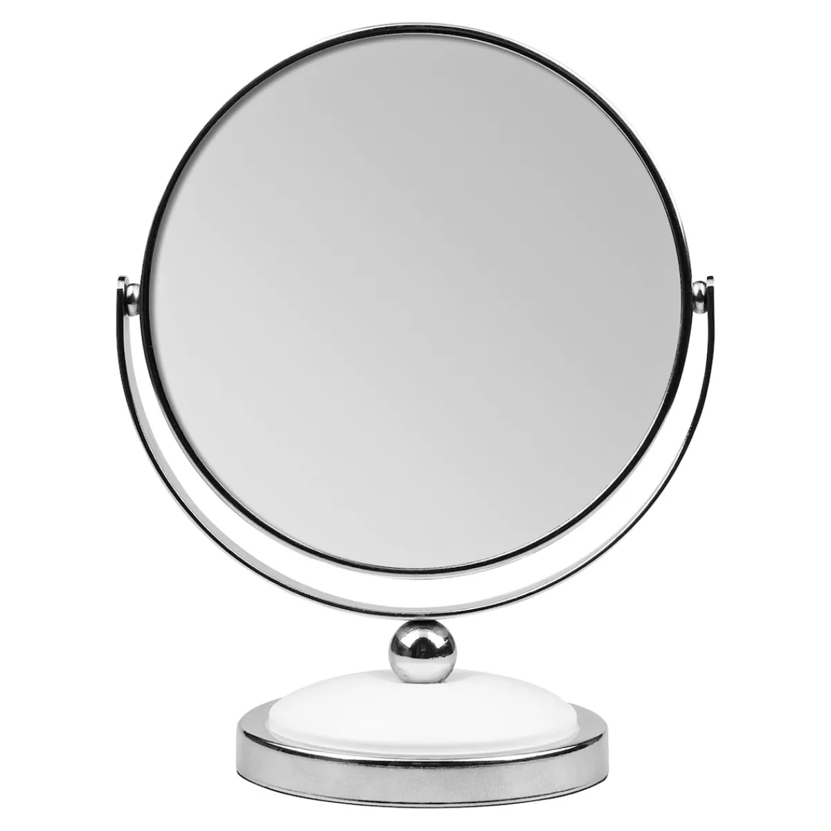 Vergrößerung? Einfach umdrehen! Runder Standspiegel mit Normalspiegel auf der einen und 5-fach-Vergrößerungsspiegel auf der anderen Seite. Schwenkbar. Fuß und Rahmen aus verchromtem Metall und weißem Kunststoff.