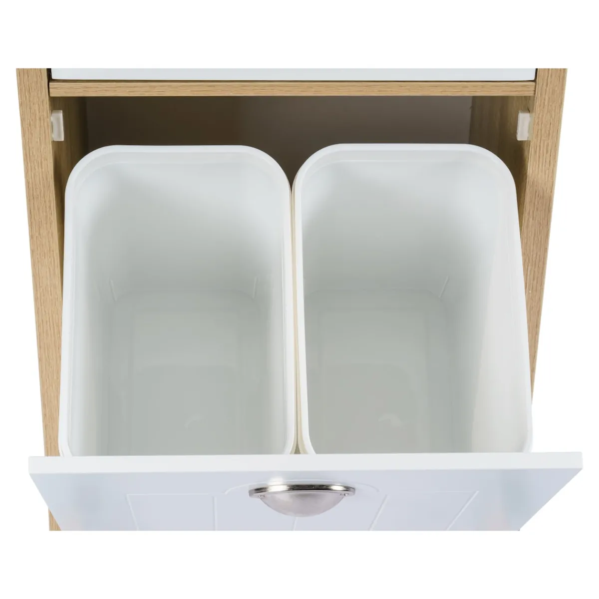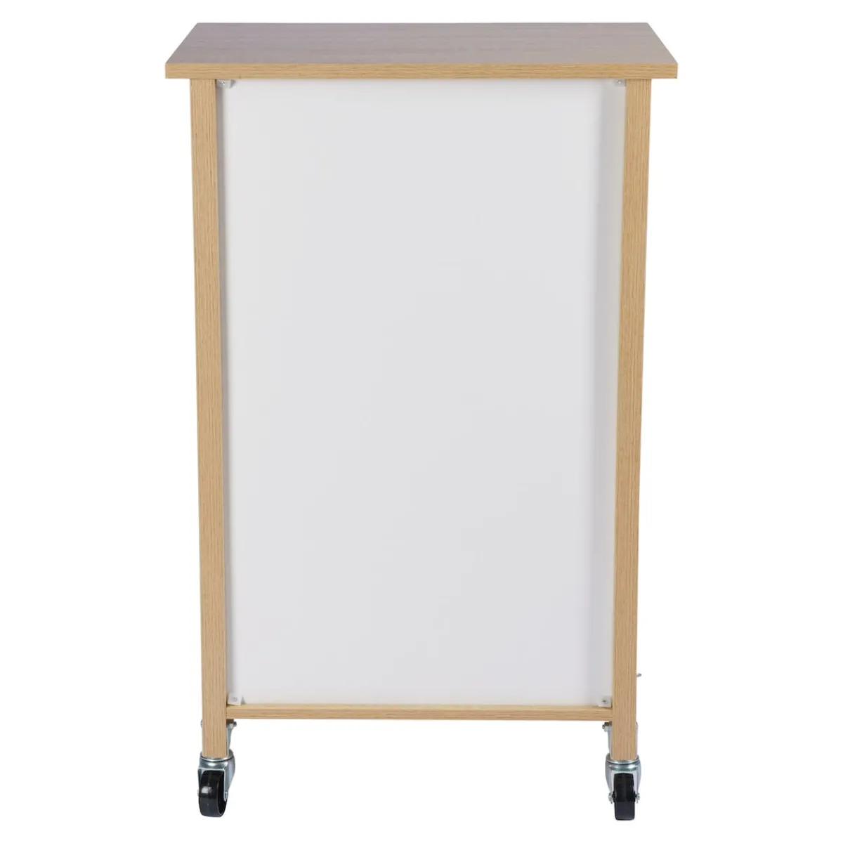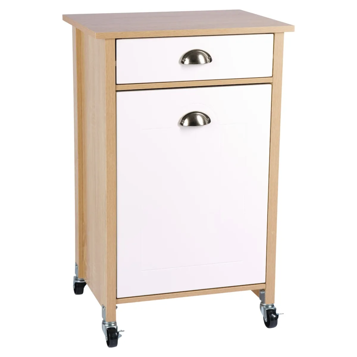 Der moderne Küchenwagen mit Mülltrennsystem schafft zusätzlichen Stauraum in der Küche. Im aufklappbaren Unterschrank befinden sich zwei herausnehmbare Abfalleimer zur Mülltrennung. Die Mülleimer besitzen ein Fassungsvermögen von je 15 Litern und sind mit Mülltütenbefestigungsringen ausgestattet. Über der Klappe ist eine Schublade angebracht, beide sind mit formschönen Metallgriffen versehen. In der zusätzlichen Aufbewahrungsmöglichkeit lassen sich Dinge wie Müllbeutel, Besteck oder andere Küchenaccessoires ordentlich und leicht zugänglich aufbewahren.