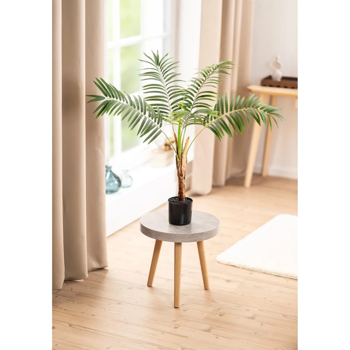 Diese Kunstpalme bringt tropisches Flair in Ihr Zuhause – ganz ohne Pflegeaufwand. Die täuschend echte Optik und die hochwertige Verarbeitung machen sie zu einem stilvollen Blickfang in jedem Raum. Im schlichten schwarzen Topf arrangiert, fügt sie sich harmonisch in jedes Wohnambiente ein. Kein Gießen, kein Düngen – einfach nur genießen!