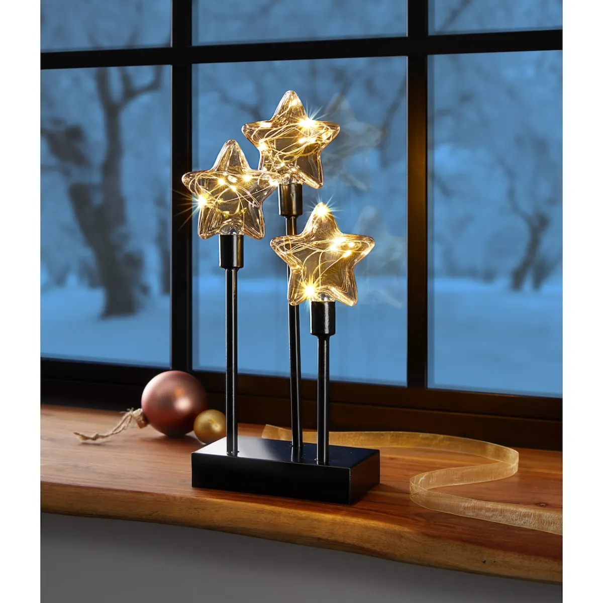 Dieses wunderschöne Sternen-Trio mit LED-Beleuchtung ist ein echter Hingucker. Stilvoll und elegant bringt es weihnachtliche Stimmung in Ihr Zuhause und ist der perfekte Deko-Artikel für die Festtage.