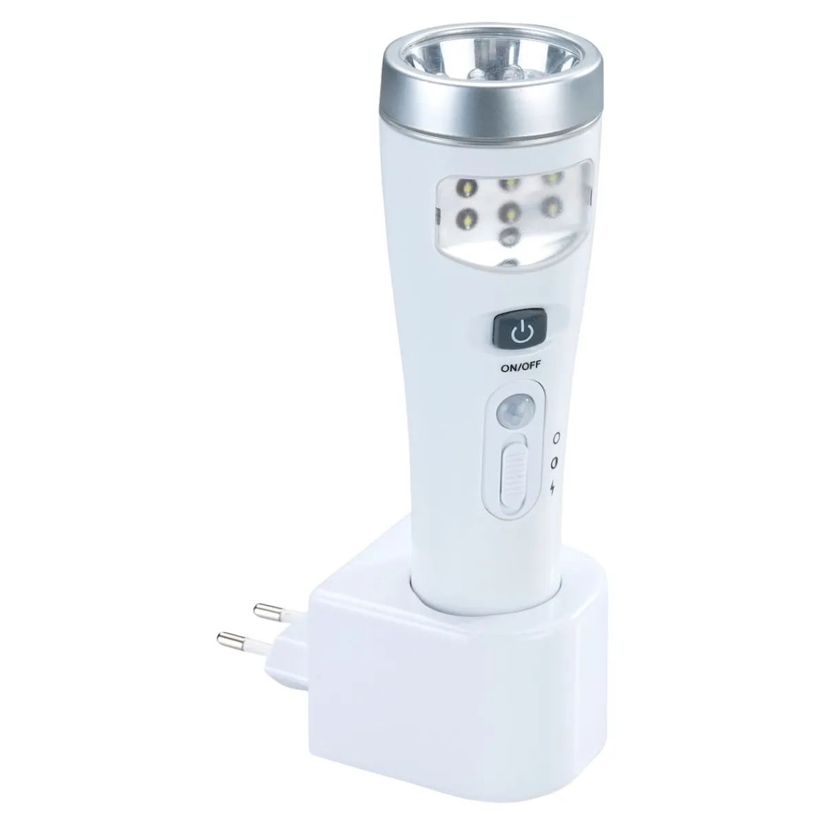 Sensor-Nachtlicht und zugleich Handleuchte mit Ladestation für die Steckdose. Ein Griff – und Sie haben eine Taschenlampe. Bewegungsmelder mit integriertem Dämmerungssensor. Mit 17 LEDs, bis zu 35 Lumen Leuchtkraft. Mit Lithium-Ionen-Akku.