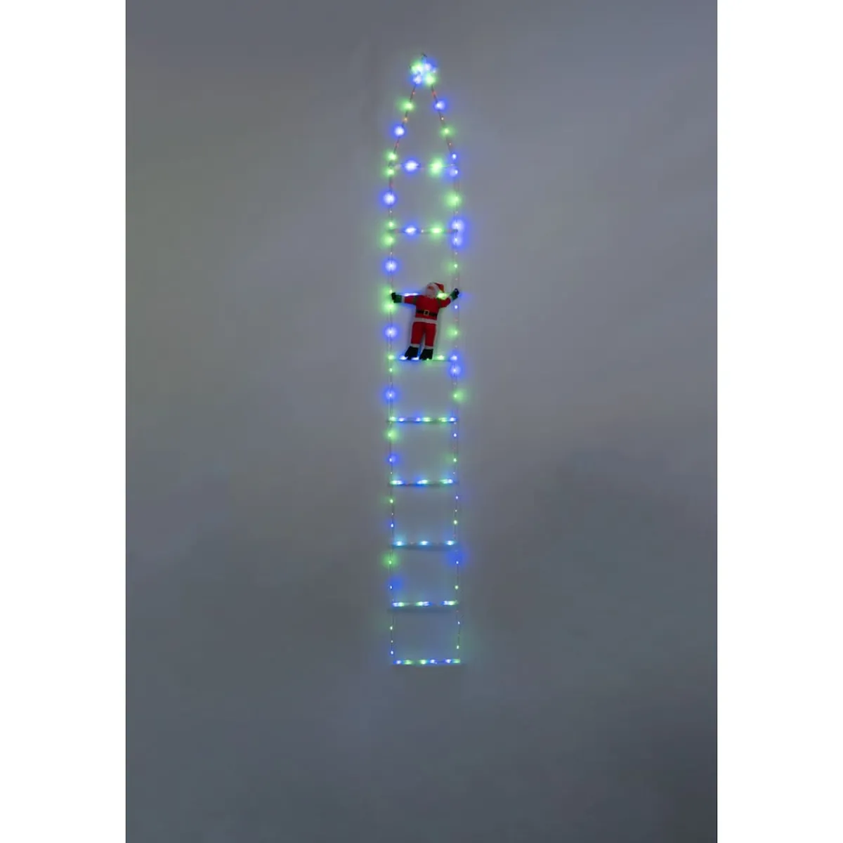 Weihnachten ist zum Greifen nah – der Weihnachtsmann erklimmt zielstrebig die bunt blinkenden Leitersprossen bis hinauf zum hell strahlenden Stern. Mit 8 verschiedenen Leuchtmodi sorgt die Leiter für magische Lichtmomente, die drinnen wie draußen für festliche Stimmung und leuchtende Augen sorgen. Dank der einfachen Befestigung mit Klettverschluss-Schlaufen lässt sich die Leiter im Handumdrehen sicher anbringen.