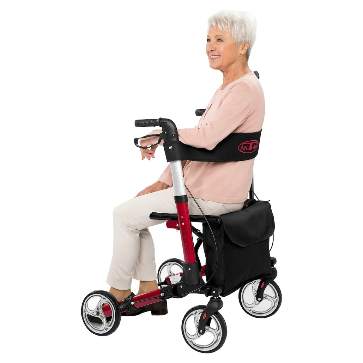 Mit dem Alu-Roller Premium von Antar erleben Sie eine neue Form der Mobilität. Denn durch sein geringes Gewicht von gerade einmal 7,3 Kilogramm lässt sich der Rollator besonders leicht manövrieren und ohne große Kraftanstrengung schieben. Die von 79,5 bis 92,5 Zentimeter höhenverstellbaren Schiebegriffe erlauben es Ihnen, den Alu-Roller ganz auf Ihre individuellen Bedürfnisse anzupassen und so den Fahrkomfort zu steigern. Für sicheren Halt sorgen die anatomisch geformten Handgriffe mit Ballenablage. Letztere ermöglicht es, sich während des Schiebens noch besser auf dem Rollator abzustützen.