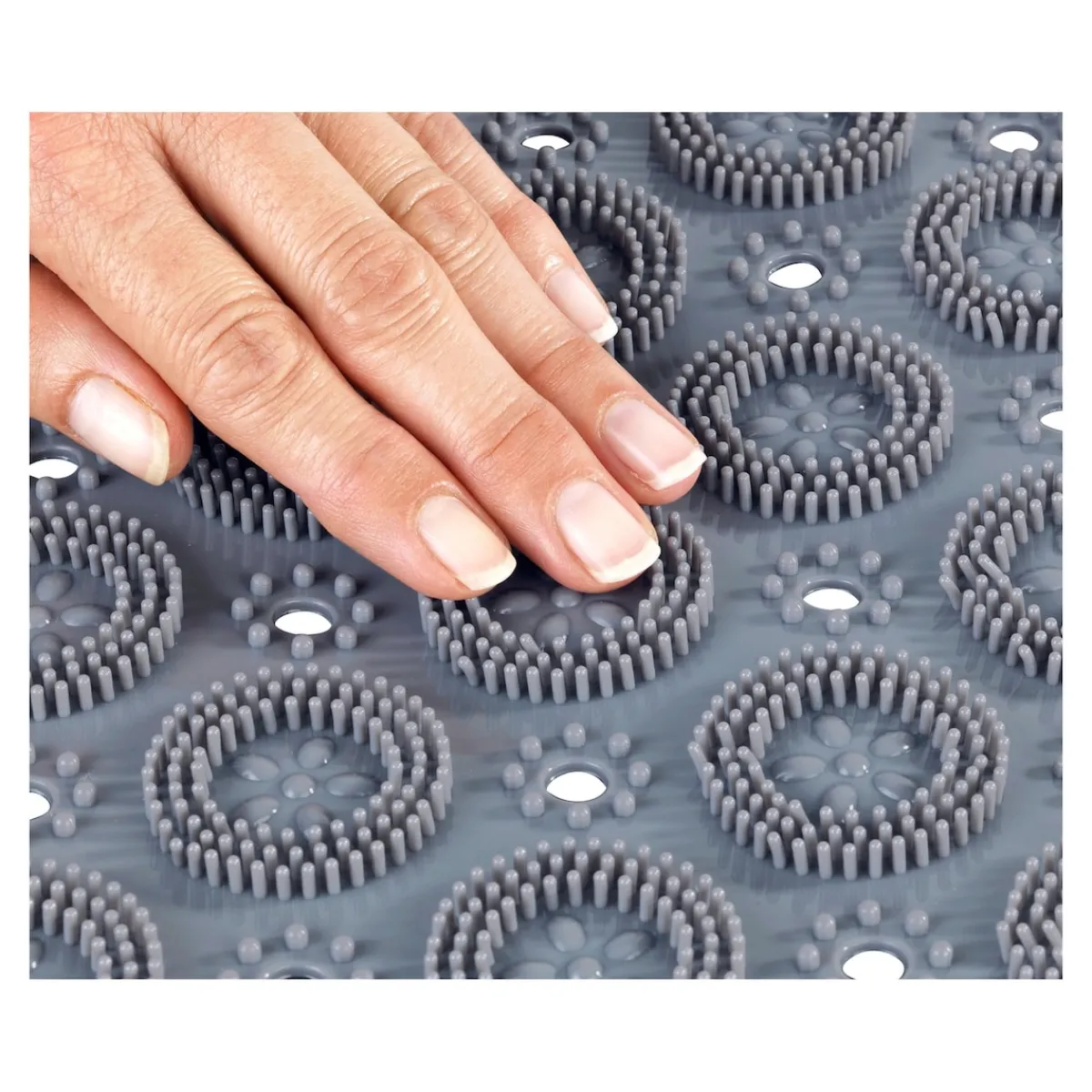Verwöhnt Ihre Füße während des Duschens mit einer Fußreflexzonen-Massage. Hunderte kleine Massagenoppen massieren und reinigen sanft, aber effektiv. Rutschsicher, dank Saugnoppen auf der Unterseite und zahlreichen Abflußöffnungen.