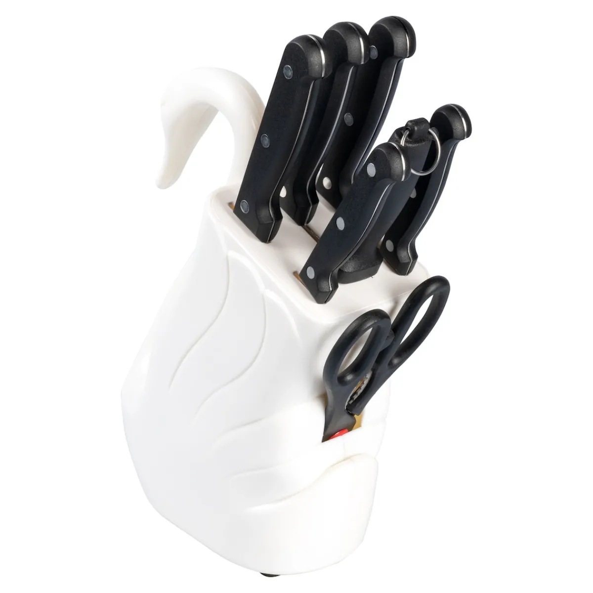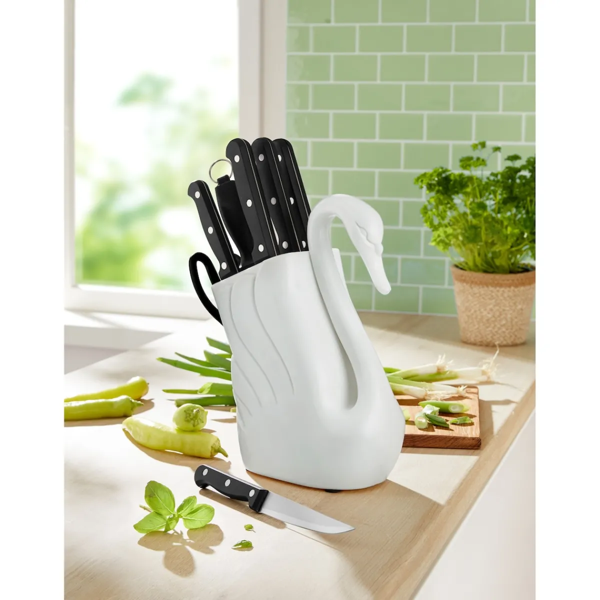 Mit großer Gelassenheit nimmt dieser anmutige Schwan Ihre Schneidwerkzeuge unter seine Fittiche: 5 verschiedene Messer, einen Messerschärfer und eine Schere präsentiert er gekonnt mit majestätischer Eleganz – eine äußerst stilvolle Messerblock-Lösung für jede Küche!