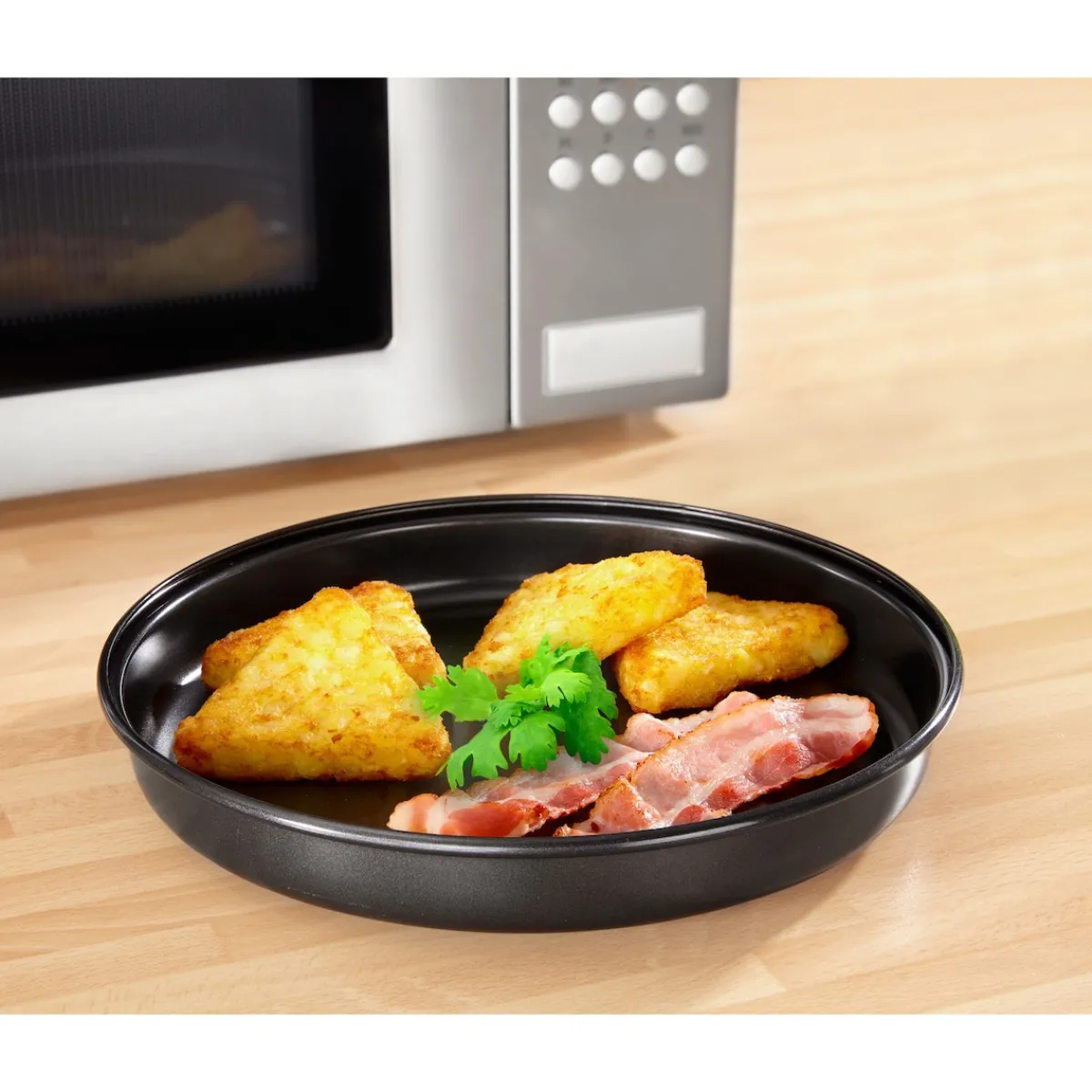 Das geht – mit dieser genialen Mikrowellen-Pfanne „Knusprig“! Speck, Pommes, Toast und vieles mehr einfach in die Pfanne legen, in der Mikrowelle garen und knusprig genießen! Geeignet für Mikrowelle und Spülmaschine.