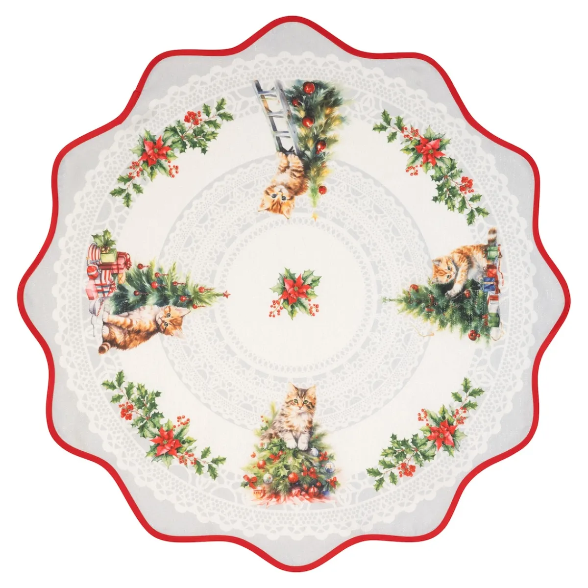 4 fleißige, schnurrende Helfer tummeln sich auf dieser hochwertigen, runden Mitteldecke und erfreuen sich am Weihnachtsbaum. Ein „Katzenjubel“ auf dieses originelle Design!