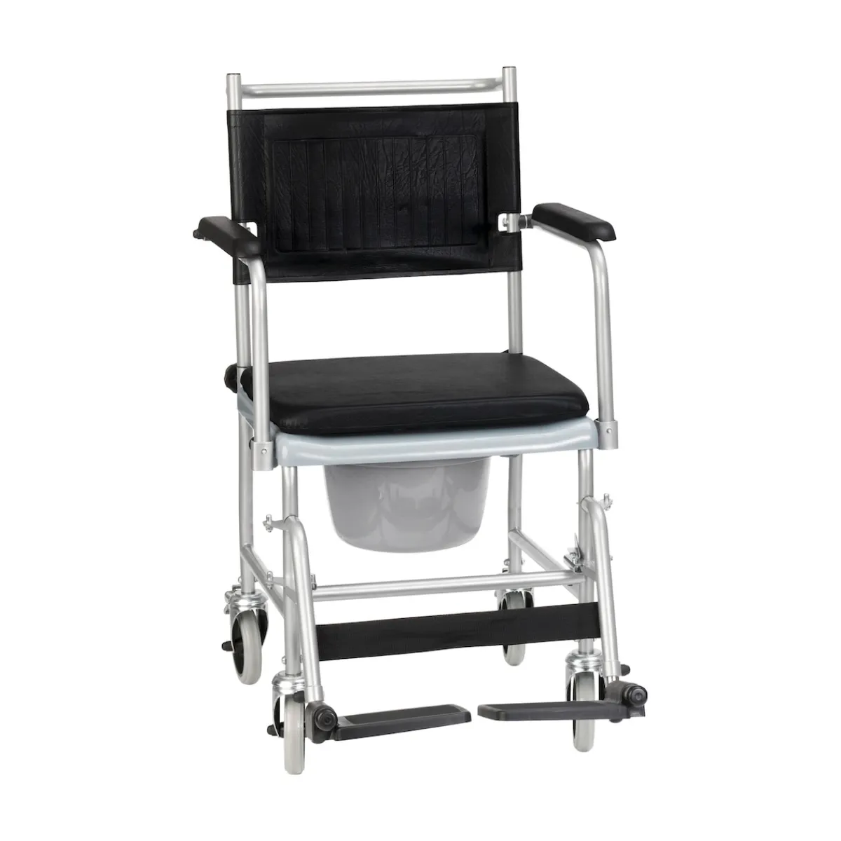 Rollstuhl und Toilettenstuhl in einem. Bequem fahrbar auf 4 Lenkrollen, die beiden hinteren mit Feststellbremse. Abnehmbares Sitzpolster. Öffnung Sitzbrille 26 x 23 cm. Entnehmbarer 5 Liter-Eimer mit Deckel und Bügel. Belastbar bis 120 kg. Einfache Montage ohne Werkzeug.