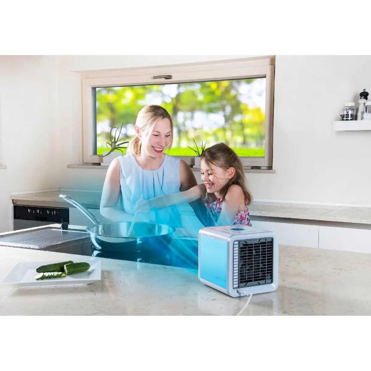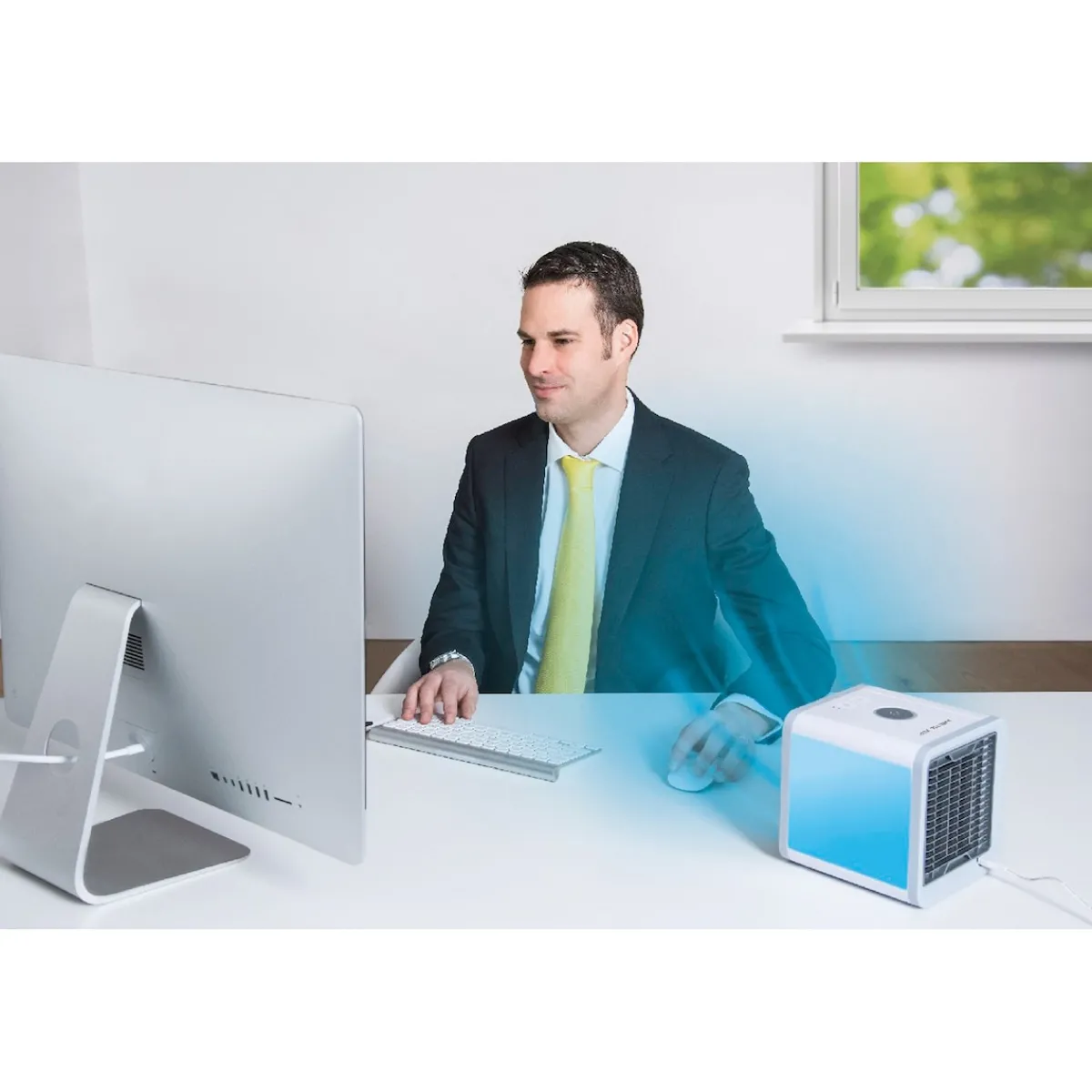 Die Funktionsweise des kompakten Leichtgewichts ist genial einfach und effektiv: Während des Betriebs saugt das würfelförmige Kühlgerät von hinten warme Luft an, kühlt sie durch Verdunsten von Wasser ab und bläst sie angenehm temperiert und angefeuchtet vorne wieder heraus. Angenehmer Nebeneffekt: Staub und andere feine Partikel werden direkt mit aus der Luft gefiltert.