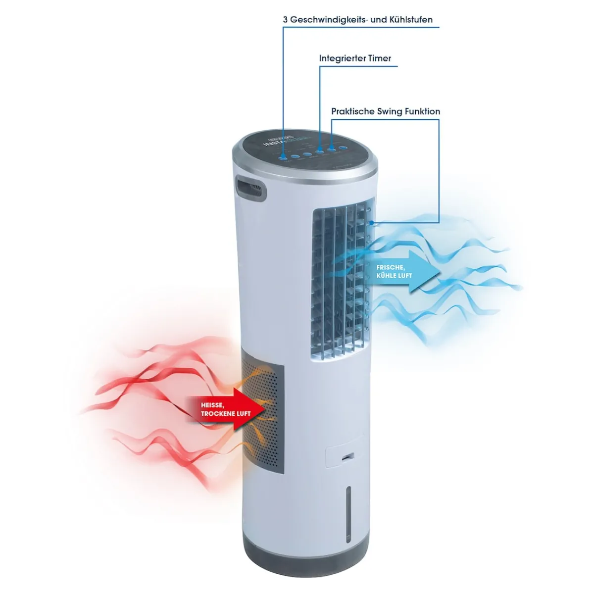 Die Funktion des Kühlgeräts ist genial einfach und sehr effizient: Die warme Umgebungsluft wird angesaugt, durch die drei integrierten Kühlpads geführt und danach angenehm temperiert und leicht angefeuchtet an die Raumluft abgegeben. Praktischer Nebeneffekt: Staub und andere feine Partikel in der Luft bleiben in den Filtern hängen.
