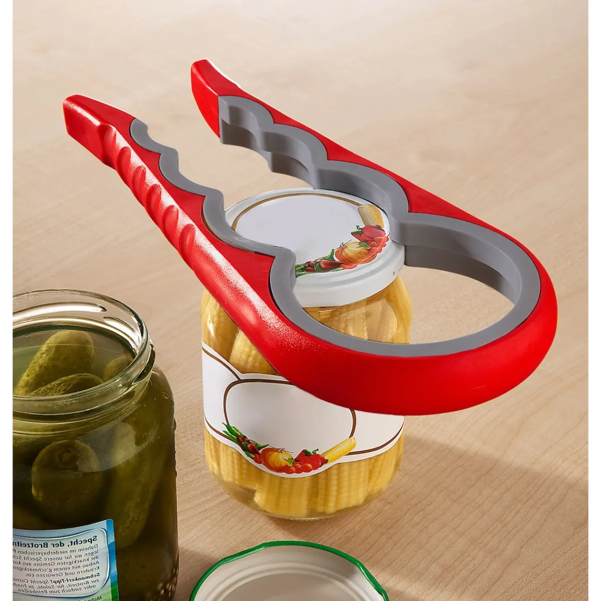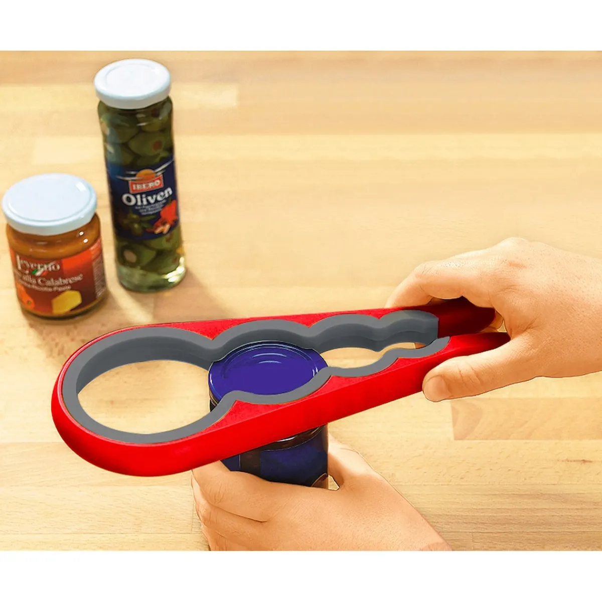 Mit diesem ergonomischen Multi-Öffner schaffen es auch weniger kräftige Hände, jedes Glas einfach zu öffnen. Optimale Druckverteilung durch passgenaue Öffnungen.