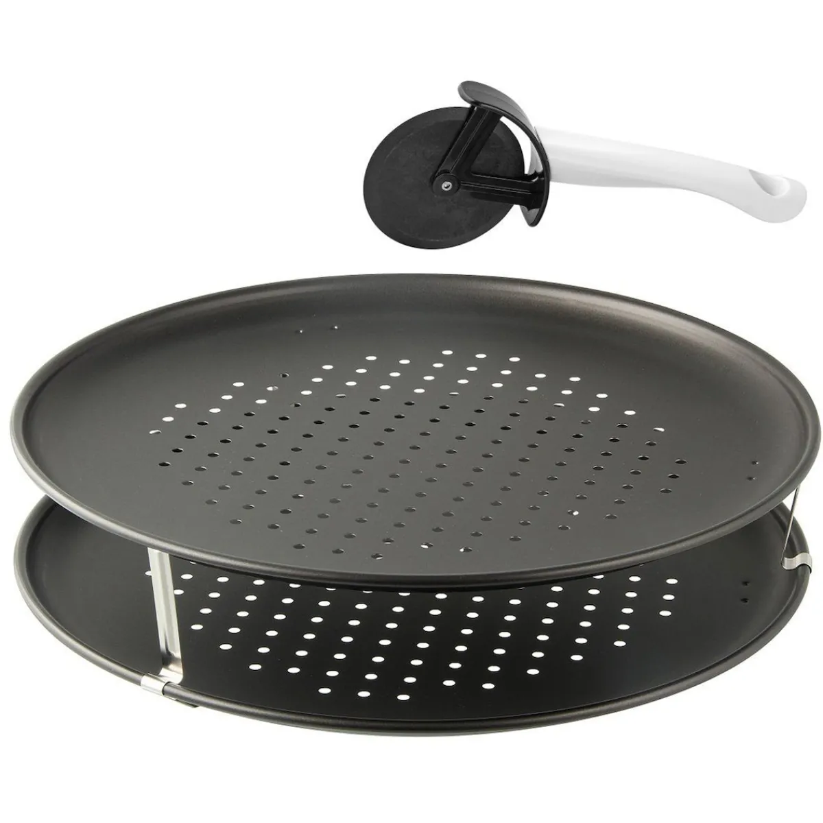 Das Zenker Pizza-Set Trio bietet alles was das Herz begehrt. Das Set in schwarz (Maße gesamt ca. Ø 32 x 15 cm) beinhaltet zwei Pizza-Bleche mit Antihaftbeschichtung, sowie drei Distanzhalter und einen Pizza-Schneider mit Nylon-Rad.