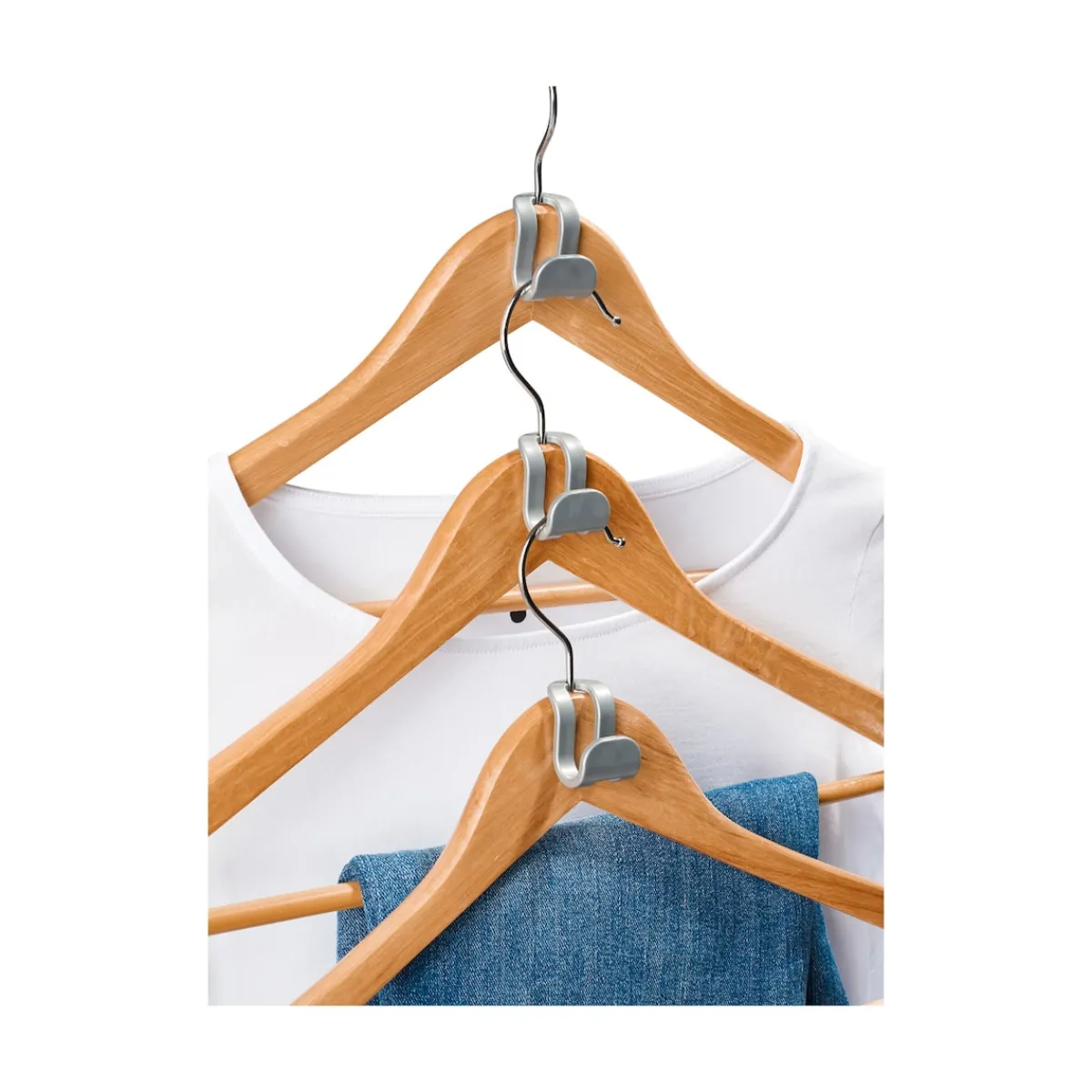 Das ist die genialste Art, Platz im Schrank zu sparen: Einfach einen Platzspar-Haken über den Haken des Kleiderbügels ziehen und schon können Sie den nächsten Kleiderbügel daran hängen. Und so geht es immer weiter.