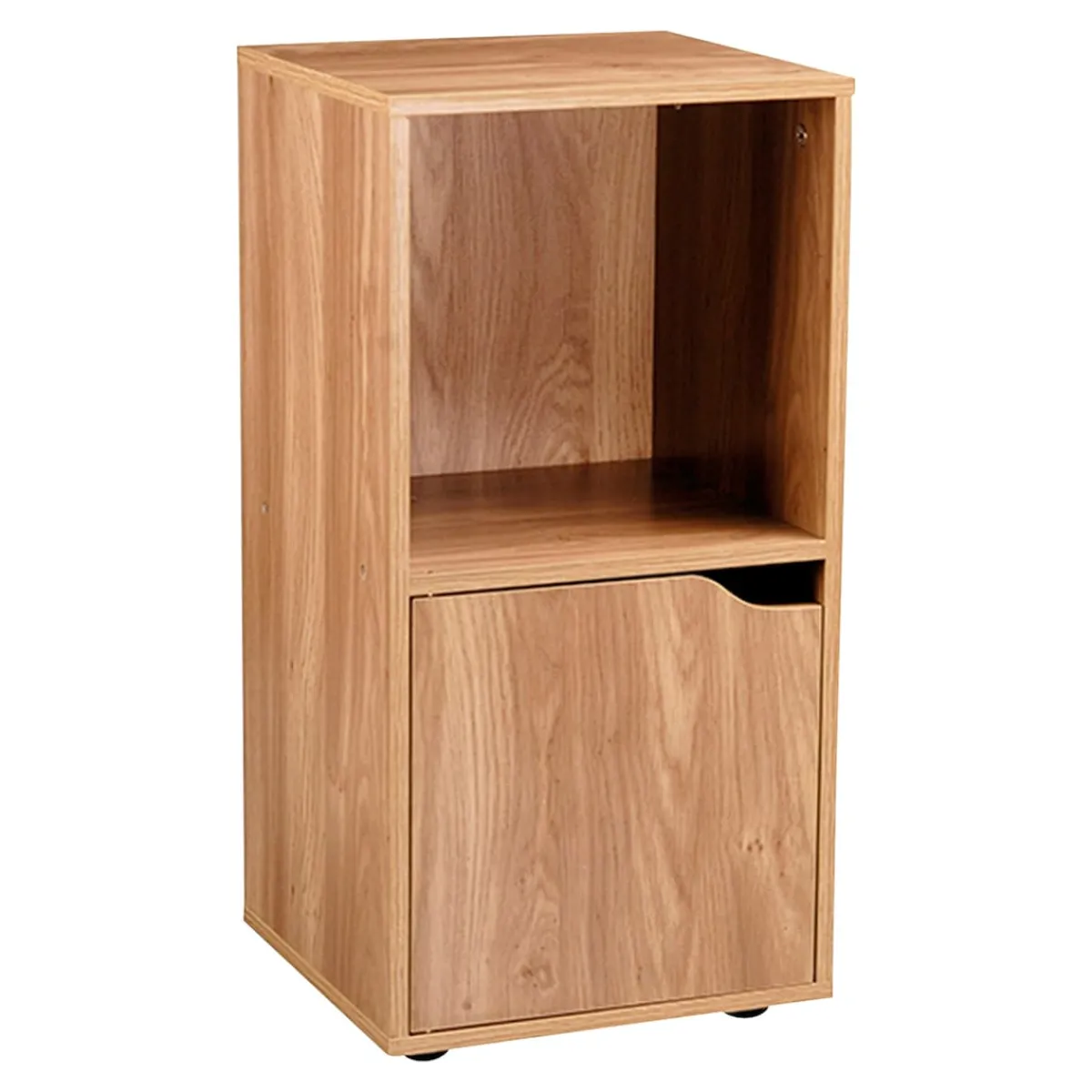 Auch Möbel können durch schlichte Eleganz bestechen – wie zum Beispiel dieses Regal-Duo, das aus zwei quadratischen Fächern besteht. Von den beiden übereinander angeordneten Fächern ist das obere offen und bietet Platz für Bücher oder Deko-Artikel, während das untere durch eine Tür geschlossen ist. Dahinter lassen sich Geschirr und andere Alltagsgegenstände verstauen, die vor Staub oder neugierigen Blicken geschützt werden sollen. Die Tür besitzt keinen Türknauf, sondern lässt sich durch eine geschwungene Aussparung am oberen Ende öffnen, was nicht nur praktisch ist, sondern dem Regal einen ganz besonderen Charme verleiht.