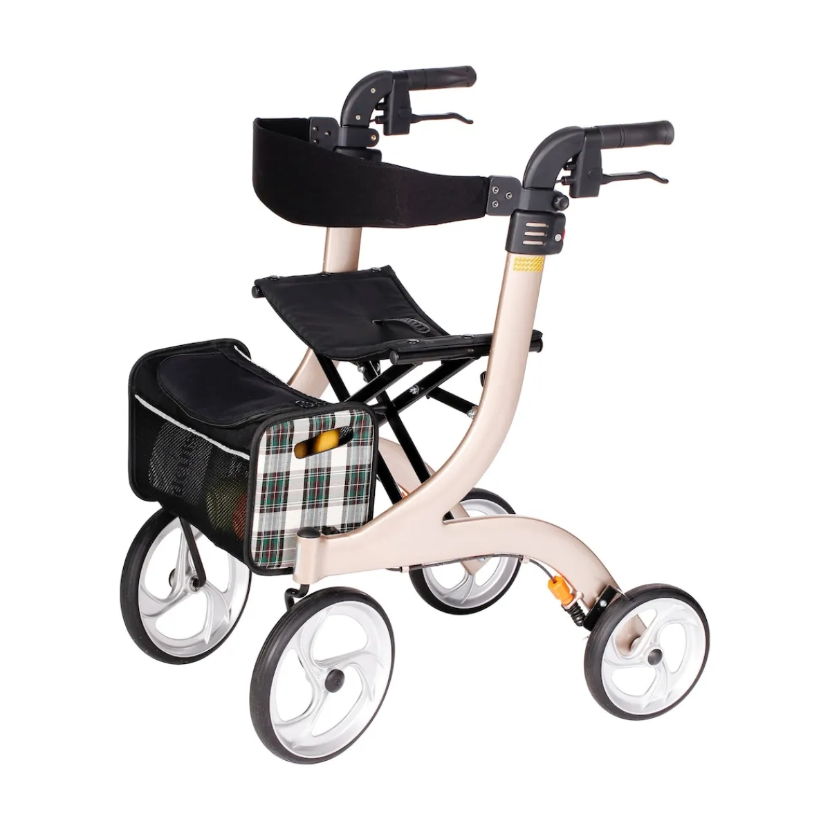 Dass ein Rollator nicht nur eine wichtige Mobilitätshilfe ist, sondern dabei auch noch chic aussehen kann, beweist das Modell Nitro, das für den Innen- und Außenbereich geeignet ist, schon auf den ersten Blick. Mit der edlen Farbkombi Champagner-Schwarz und den großen Lenkrädern mit einem Durchmesser von 25 cm macht dieser Rollator in jeder Hinsicht eine gute Figur. Dabei kommt die Funktionalität jedoch keineswegs zu kurz: Die Räder mit PU-Bereifung sorgen für optimalen Lenk- und Fahrkomfort und die doppelte Querverstrebung für mehr Stabilität und Sicherheit.