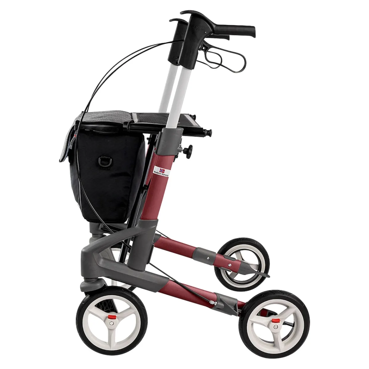 Die Höhenverstellung der Handgriffe erfolgt intuitiv und ermöglicht eine individuelle Anpassung an die Bedürfnisse des Benutzers. Der flexible Handgriff (ErgoGrip) bietet nicht nur einen bequemen Griff beim Gehen, sondern dient auch als Armlehne im Sitzen. Die stoßabsorbierenden Reifen sorgen für eine sanfte Federung und einen außergewöhnlichen Fahrkomfort.