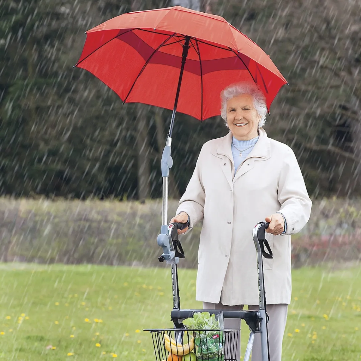 Windsicherer Schirm? Hier ist er! Der Schirm mit Adapter – passend auch für Ovalrohre – schützt vor Regen und Sonne, während der Rollator beidhändig geführt werden kann. Mit individueller Höheneinstellung und bedienungsfreundlicher Automatiköffnung. Auch für Rollstühle geeignet.