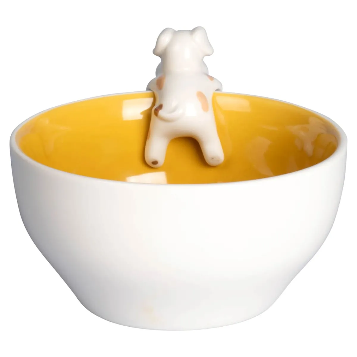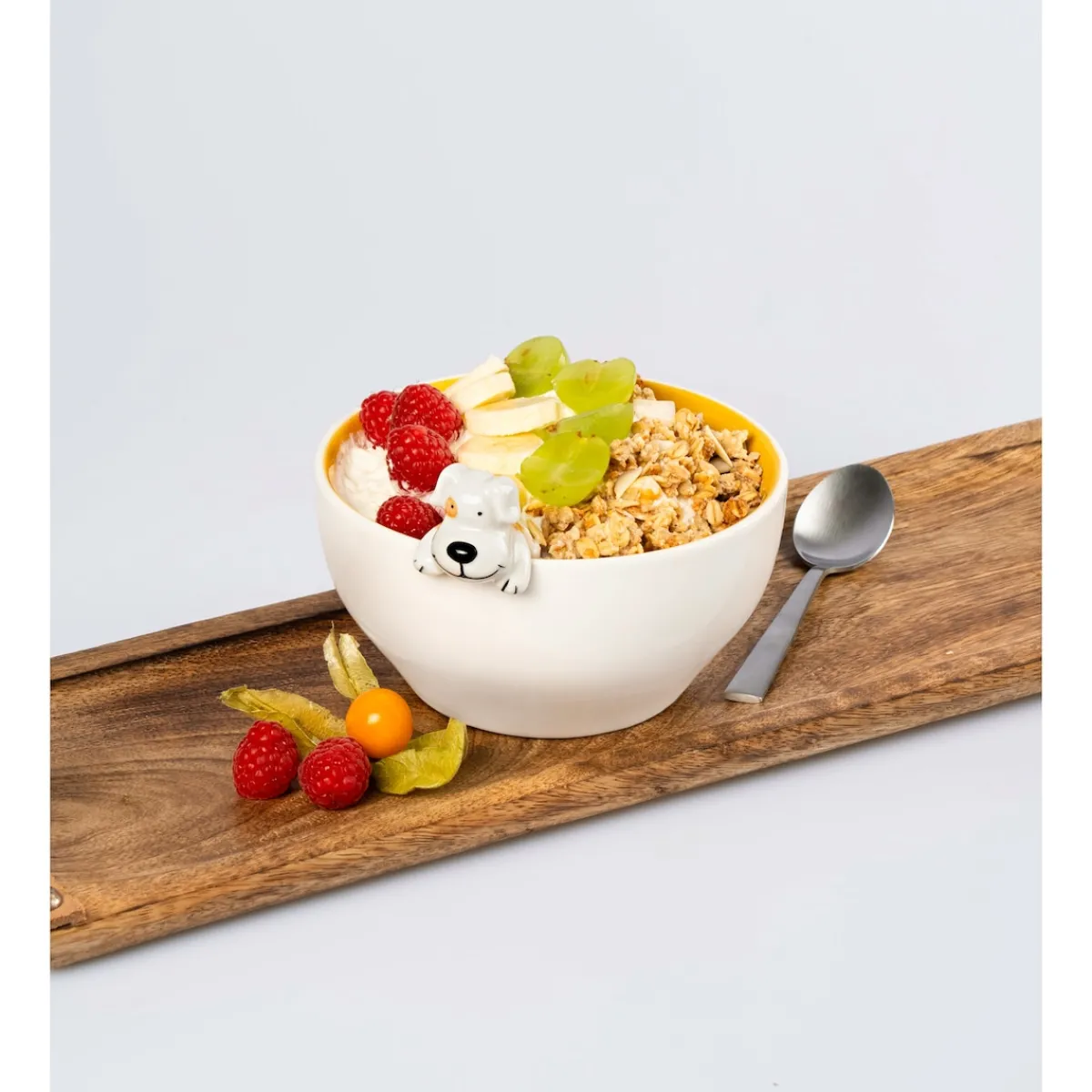 Na, der traut sich was: Hündchen „Oskar“ begrüßt Sie schon zum Frühstück mit Schabernack und lässt fröhlich seine Beine in Müsli baumeln – dabei ist es ihm völlig gleich, ob sein weißes „Fell“ ein wenig „schmutzig“ wird. Eine süße Bereicherung für jeden Frühstückstisch!