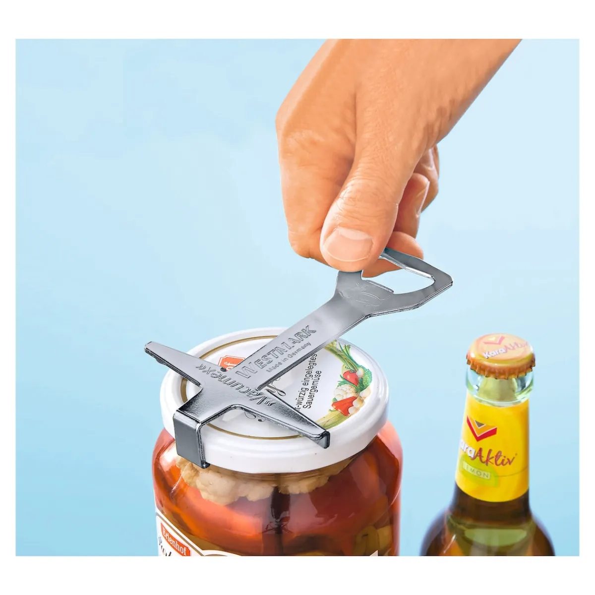 Mit diesem genialen Helfer lösen Sie im Nu das Vakuum von Schraubgläsern – ohne großen Krafteinsatz und ohne den Deckel zu beschädigen. Für Deckel bis 19 mm Höhe.