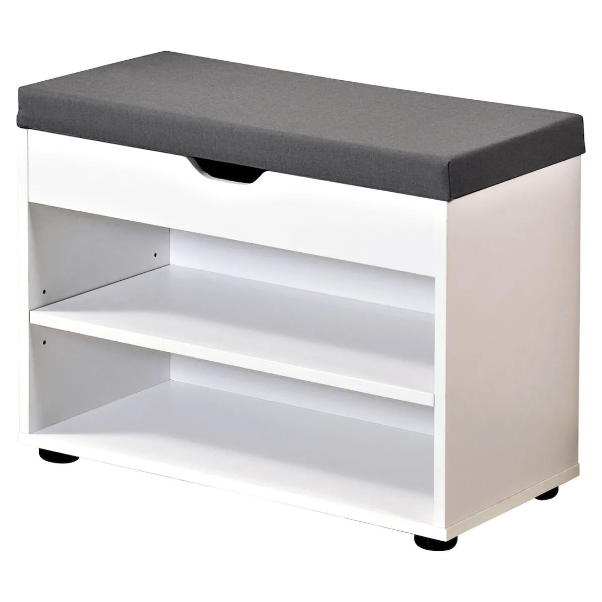 Das bequeme Sitzkissen ist ideal zum Anziehen der Schuhe ohne lästiges Bücken geeignet. Das ist besonders dann hilfreich, wenn es sich um Schuhe mit Schnürsenkeln handelt. Unter der aufklappbaren Sitzfläche befindet sich ein praktisches Fach zum Verstauen von kleinen Gegenständen. Von Handschuhen über Schals und Mützen bis zum kleinen Regenschirm oder Schuhputzzeug findet hier alles Platz, was in der Garderobe benötigt wird. Dabei lässt sich dieses kleine Multitalent auch anderweitig nutzen, zum Beispiel in der Küche oder im Kinderzimmer. Die beiden Fächer dienen dann als praktisches Regal mit bequemer Sitzfläche. Das schlichte, moderne Design des Schuhschranks mit Sitzkissen passt zu jedem Einrichtungsstil und verleiht dem Raum ein gemütliches Flair.