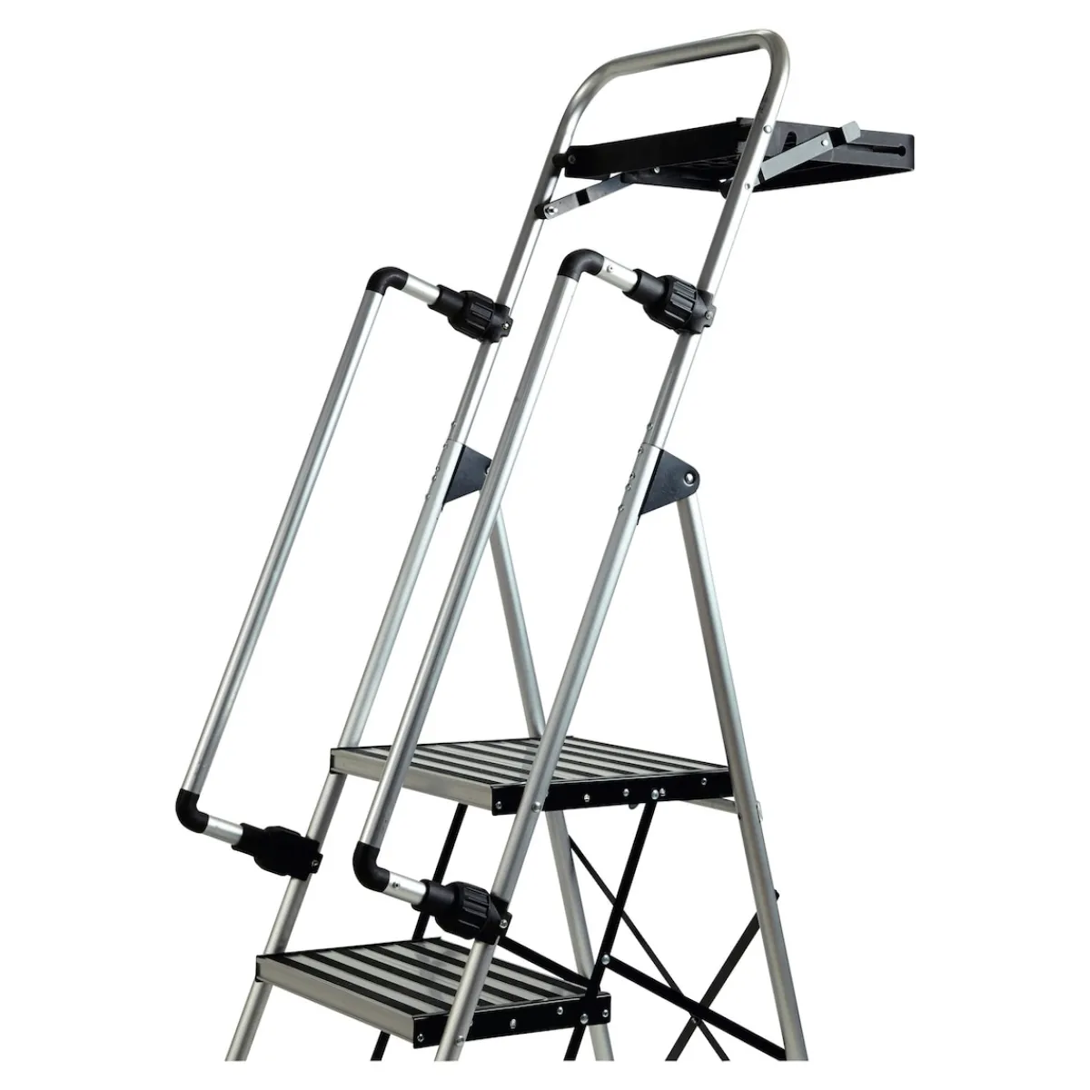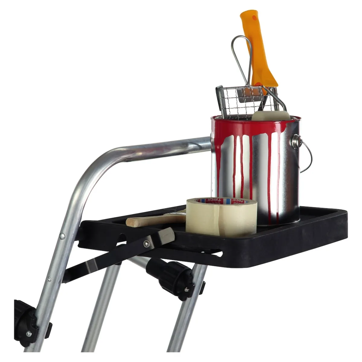 Der erhöhte Sicherheitsbügel und das ausklappbare Ablagetablett am Bügel erleichtern das Arbeiten erheblich. Sie können Ihre Werkzeuge oder Materialien bequem ablegen, ohne die Leiter verlassen zu müssen, was Zeit und Energie spart. Der Abstand zwischen den extragroßen, rutschhemmenden Trittflächen ist großzügig bemessen (24 cm), sodass Sie beim Auf- und Absteigen nicht hängenbleiben und Ihre Sicherheit nicht gefährden.