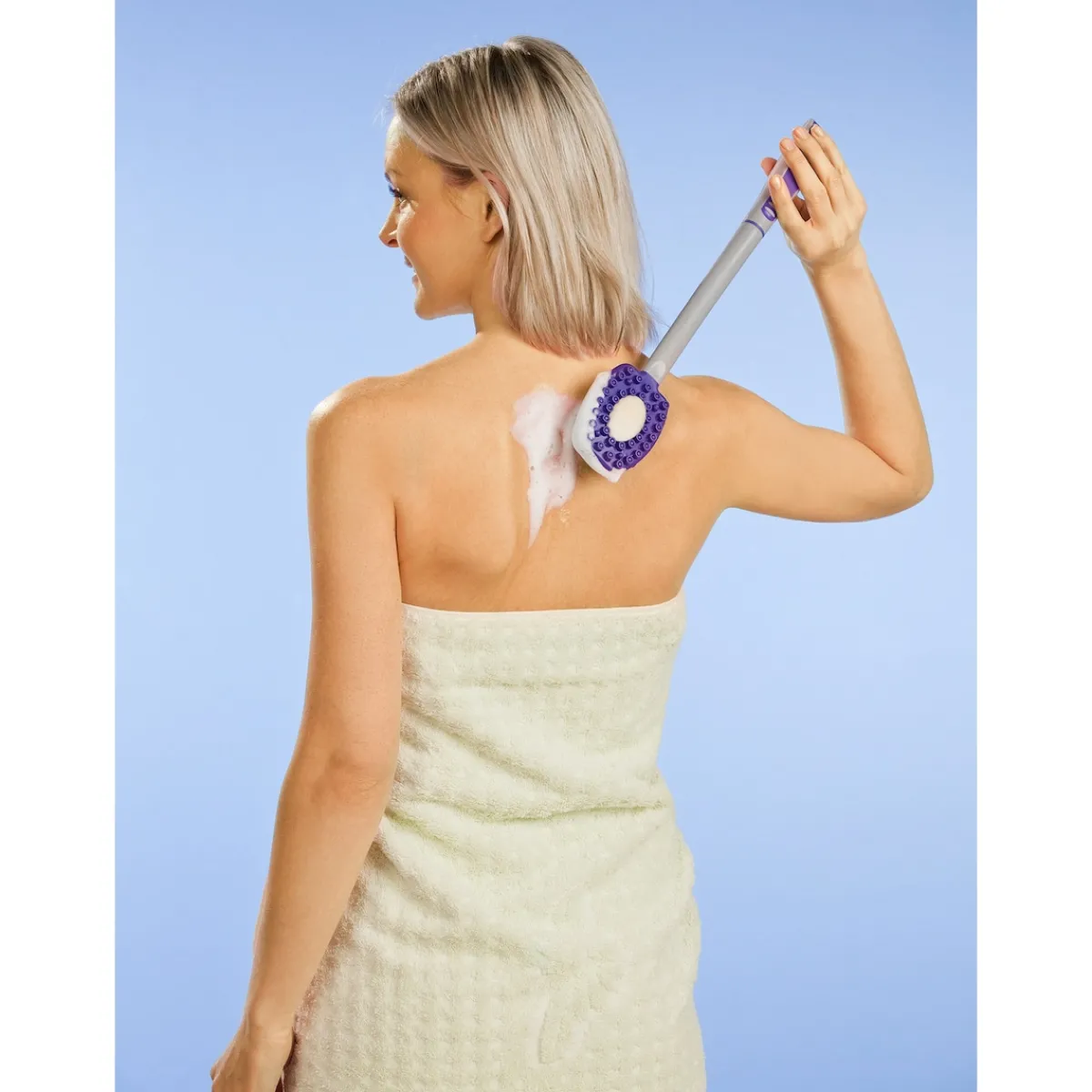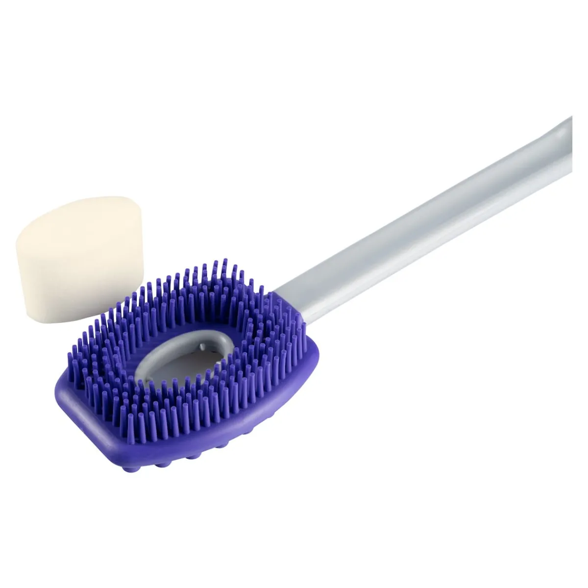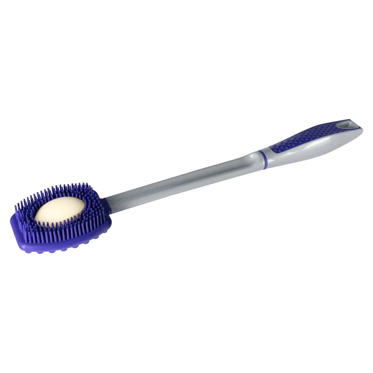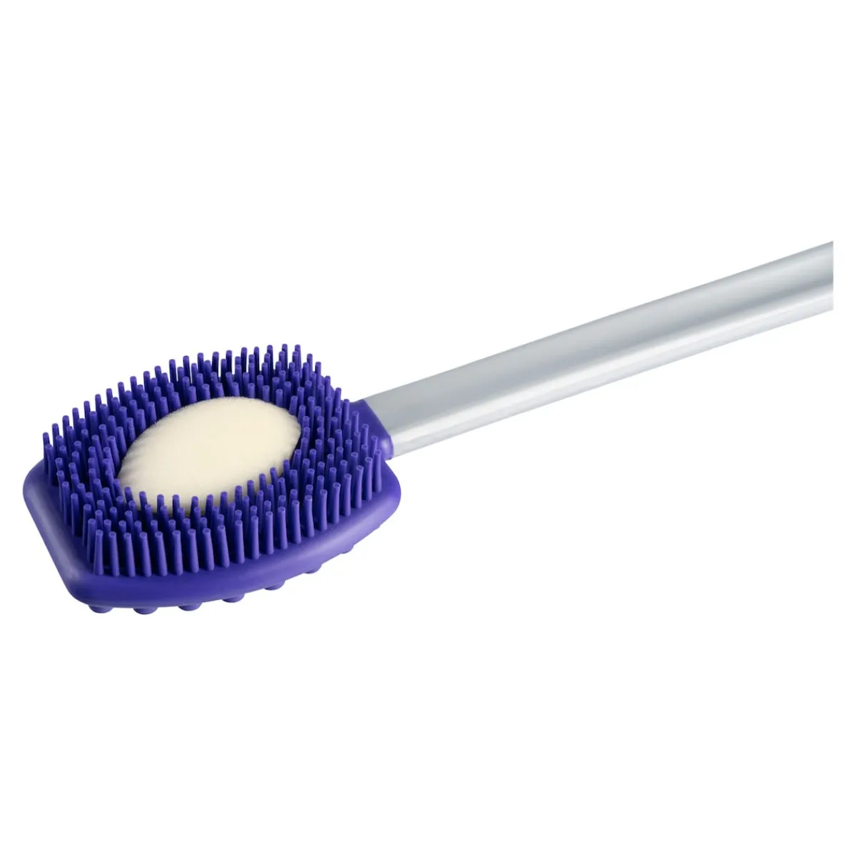 Die Silikon-Wellness-Bürste dient aber nicht nur zur Massage, sondern erleichtert auch die Körperpflege. Dafür verfügt sie auf der anderen Seite des Bürstenkopfs über ein herausnehmbares Schwämmchen. Mit diesem können Sie beim Duschen nach Belieben Seife oder Duschgel auf dem Rücken und anderen schwer zugänglichen Körperstellen wie den Füßen oder Beinen verteilen und aufschäumen. Praktisch: Die Bürste lässt sich nicht nur unter der Dusche, sondern auch danach zum bequemen Eincremen mit Körperlotion verwenden. Nach der Nutzung können Sie die Silikon-Wellness-Bürste einfach mit der Öse am Handgriff aufhängen und trocknen lassen.