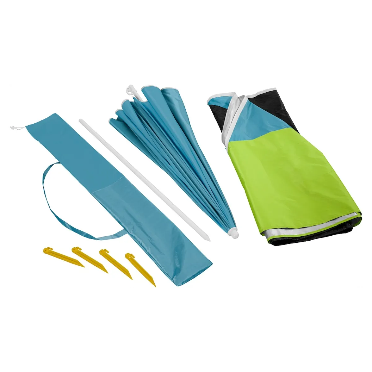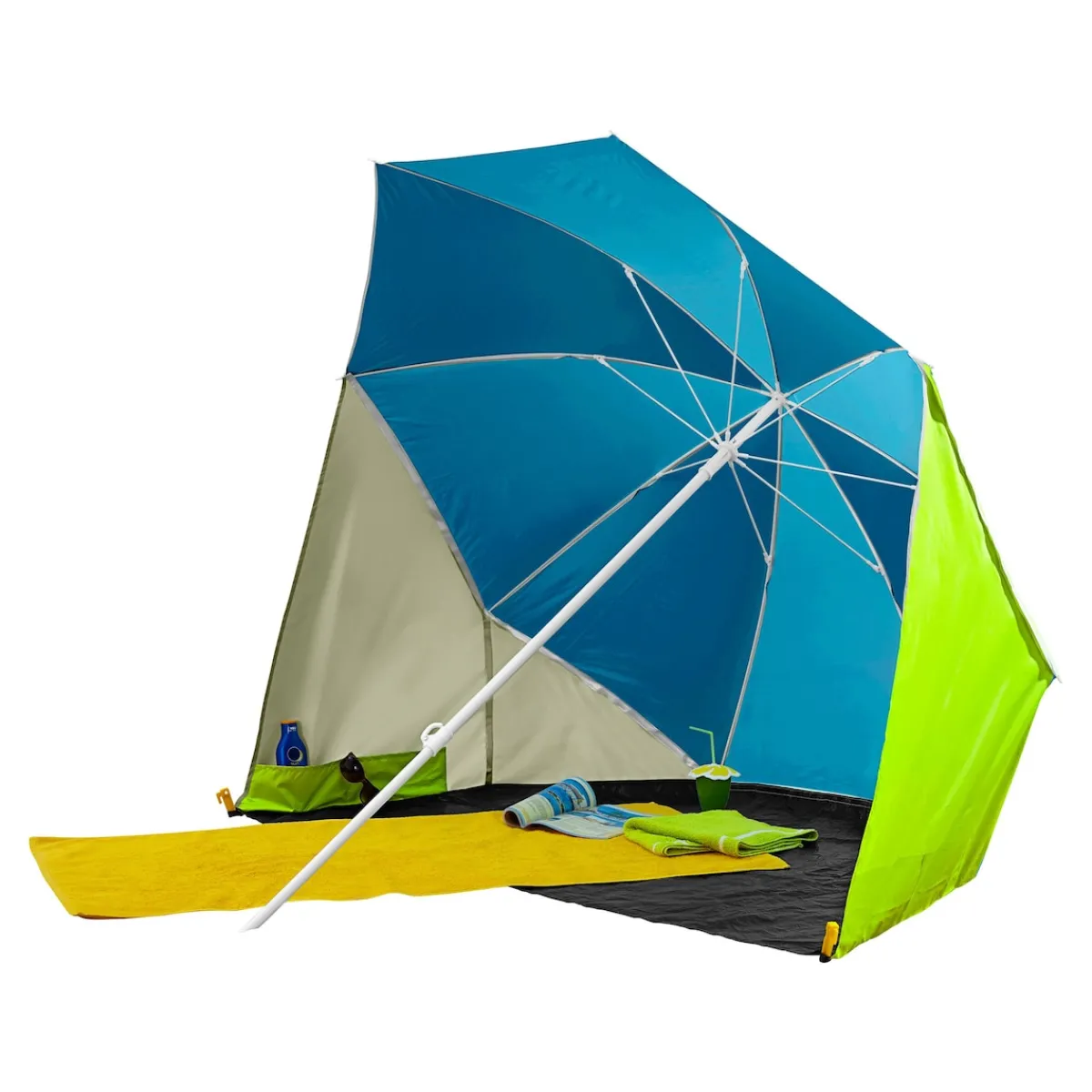 Praktisch: Dieser geniale Helfer lässt sich als Sonnenschirm verwenden und kann sich zusätzlich in eine gemütliche Strandmuschel verwandeln. Mit Heringen zur einfachen Befestigung und Tragetasche. UPF 25.