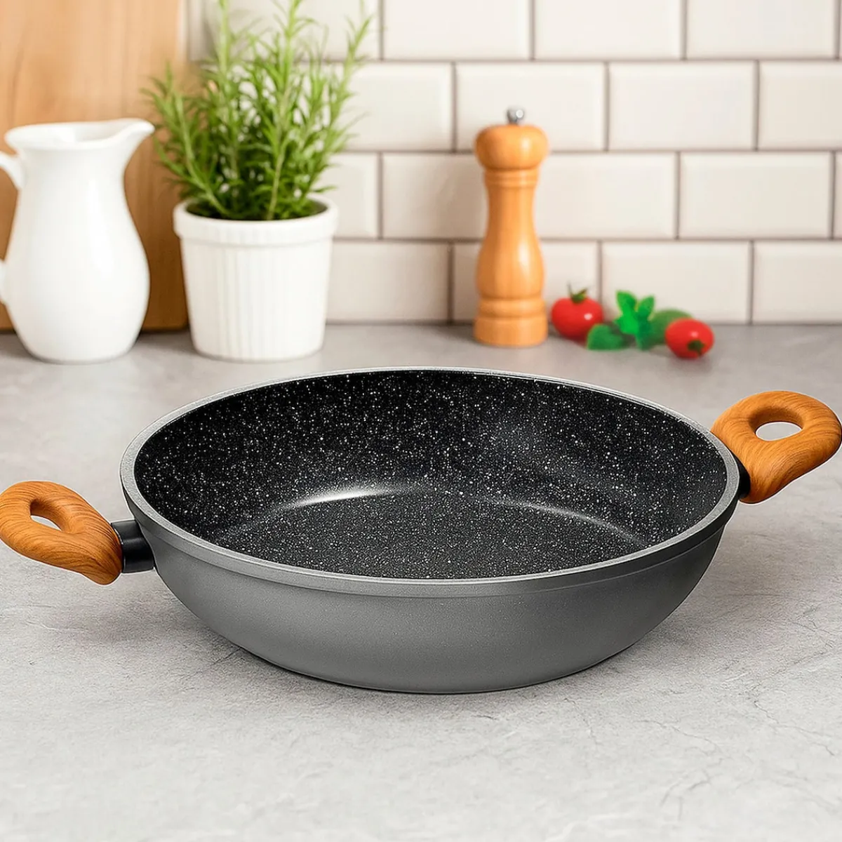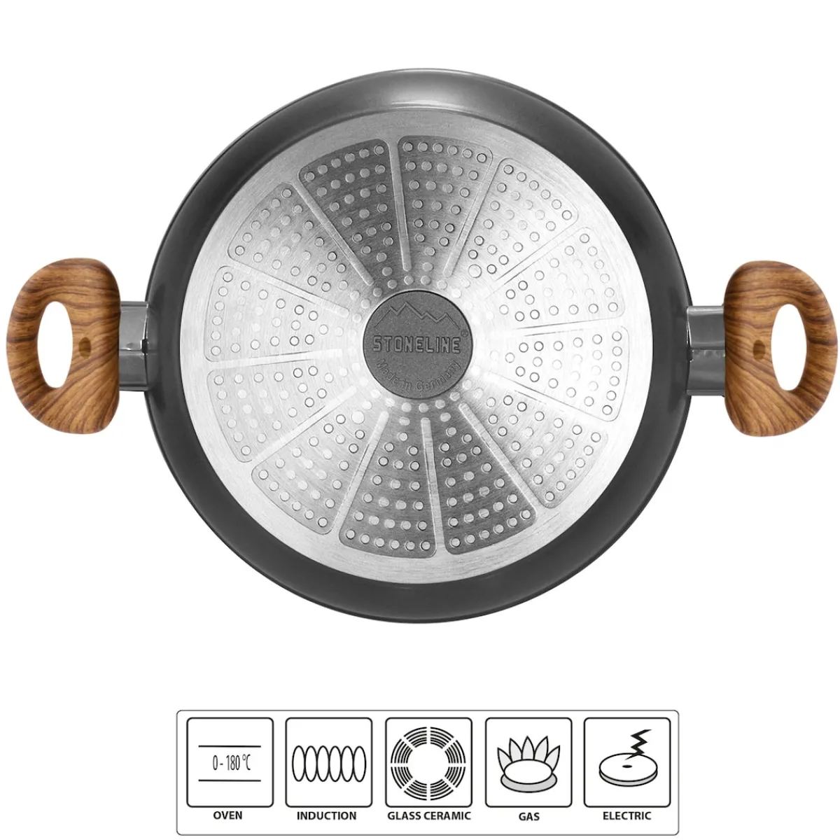 STONELINE – Das Original!Gesund fettfrei kochen und braten!Holz ist das angesagte Style-Element, um jedem Küchen-Ambiente einen warmen Akzent zu verleihen und eine beruhigende, ausgeglichene Atmosphäre zu schaffen. Die Back to Nature-Linie von STONELINE vereint diese Eigenschaften. Die Produkte in stilvoller Holzoptik werden selbst auf der gedeckten Tafel zu einem stimmigen Blickfang. Mit dieser Servierpfanne servieren Sie Ihre Speisen ganz einfach vom Herd direkt auf den Tisch! Die beiden praktischen, kurzen Griffe sorgen dafür, dass Sie die große Pfanne auch dann noch im Griff haben, wenn sie gut gefüllt ist. Diese Servierpfanne ersetzt die herkömmliche Servierschüssel. So kommen Ihre Gerichte immer heiß auf den Tisch und bleiben länger heiß. Dank der speziellen STONELINE-Antihaftbeschichtung lassen sich Ihre Speisen – je nach Wunsch – mit oder ohne Bratfett und Ol zubereiten und ganz ohne Ankleben aus dem Kochgeschirr lösen. Hierbei spielt es keine Rolle, ob Sie auf Glaskeramik, Induktion, Elektro oder Gas kochen. In Kochgeschirr mit der original STONELINE-Beschichtung bleiben keine hartnäckigen Reste haften und die einfache Handwäsche spart Ihnen Zeit und Mühe. 1 Servierpfanne, ø ca. 28 cm, Höhe: ca. 6,4 cm, ca. 3,1 l Die wichtigsten Vorteile des STONELINE Kochgeschirrs auf einen Blick: Kratzfeste STONELINE-Antihaftbeschichtung Vitaminschonend kochen und braten ohne Fett und Ol Optimales Bratergebnis und kross gebratenes Fleisch Auch für Vegetarier geeignet: Gemüse bleibt knackig und saftig Kein Anbrennen und kein Ankleben Super leicht zu reinigen Extra starker, verziehfreier Boden Bodenstärke: 4,5 mm Für alle Herdarten geeignet, auch Induktion Backofengeeignet bis 180 °C Material: Aluminium Reinigungs- und Pflegetipps: Vor dem ersten Gebrauch empfehlen wir, Ihr Koch- oder Backgeschirr mit etwas Wasser und einem milden Spülmittel gründlich auszuwaschen.Verteilen Sie anschließend mit einem Papierküchentuch einige Tropfen Speiseöl auf der Beschichtung.Bei der weiteren Nutzung können Sie auf den Einsatz von Fett oder Ol verzichten!Dank dem Easy-Clean-Effekt wird die Reinigung per Hand empfohlen. Einfach mit heißem Wasser, Handspülmittel und einem weichen Schwamm auswischen.