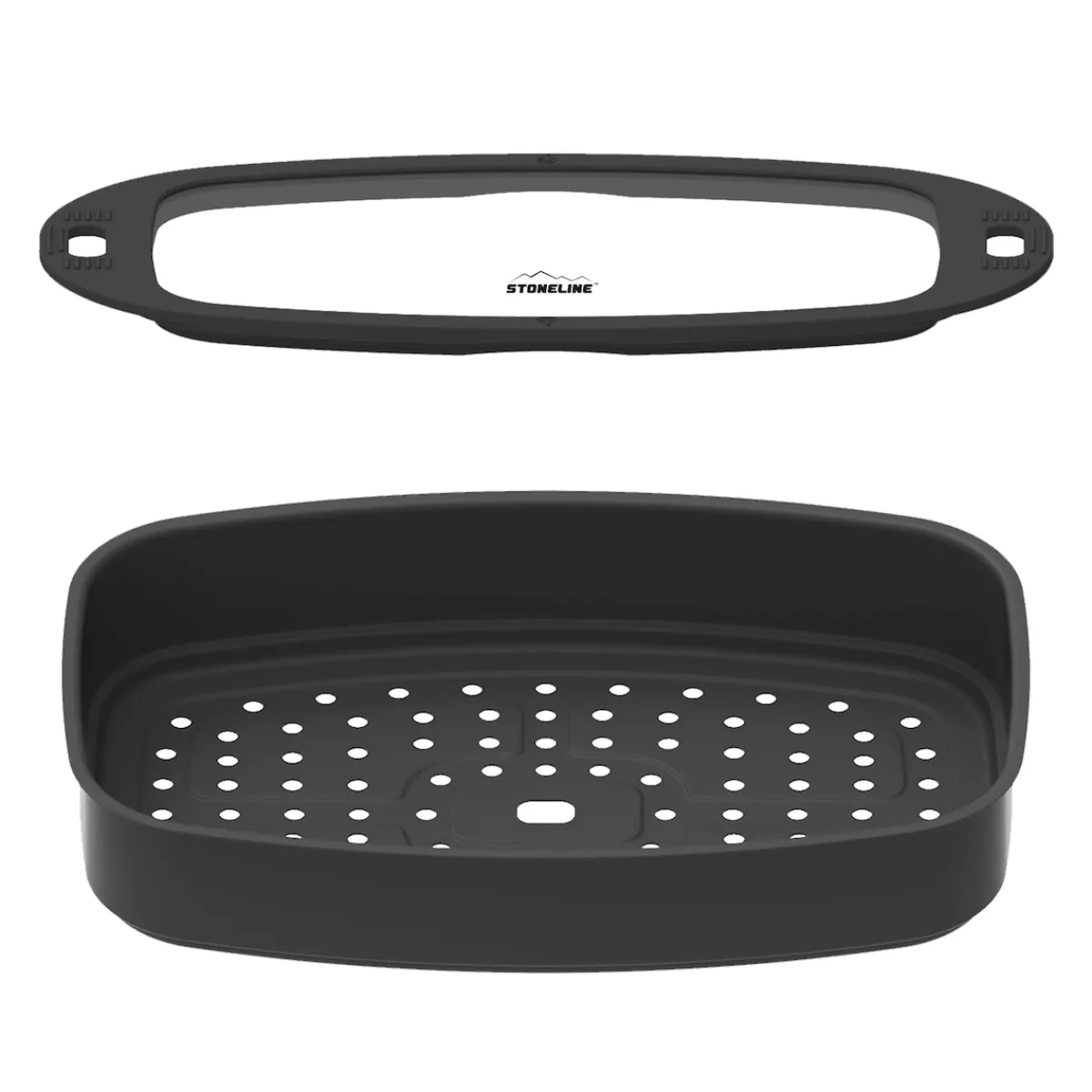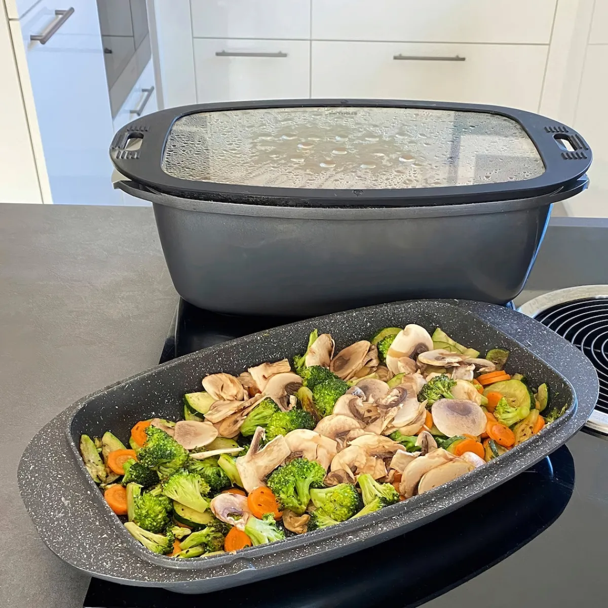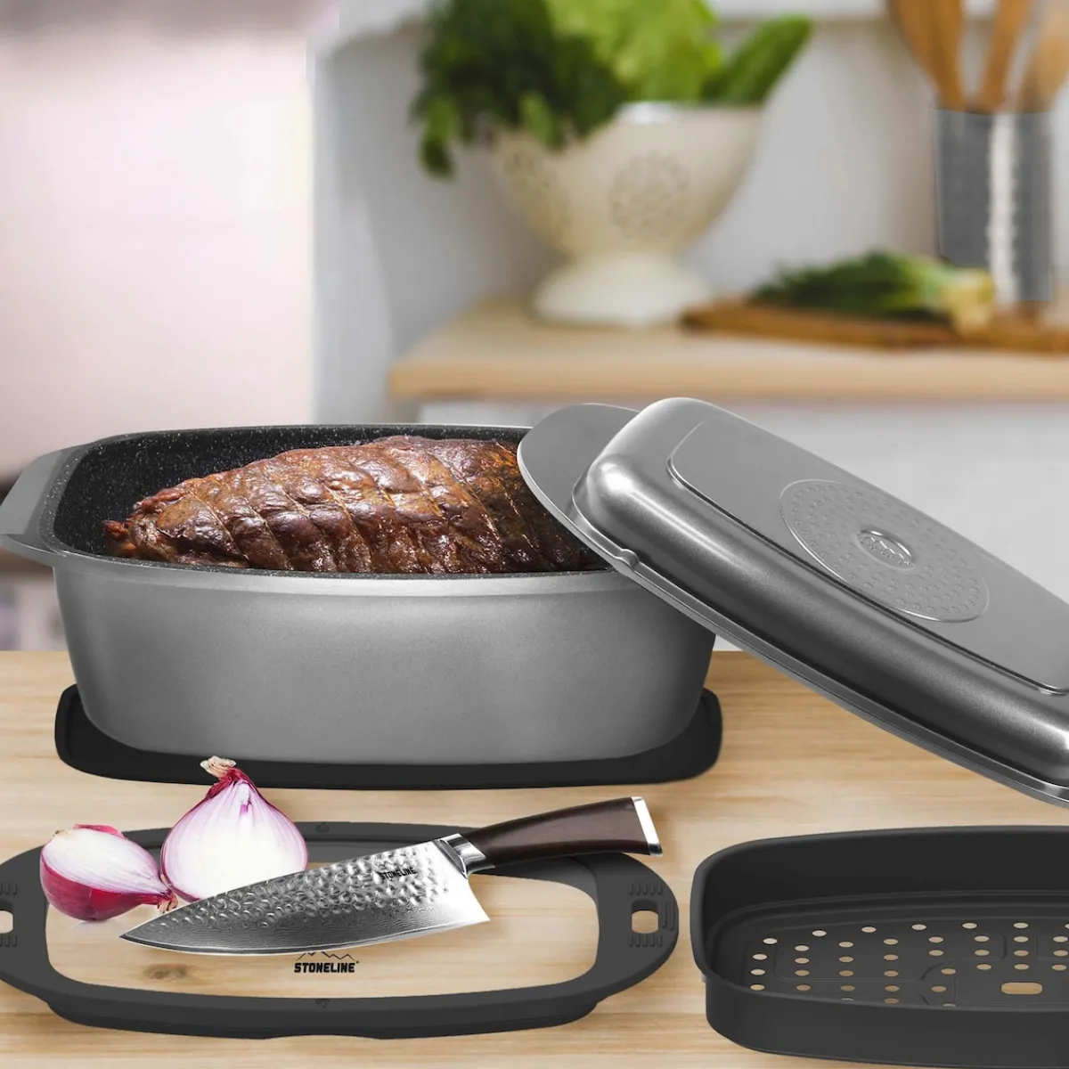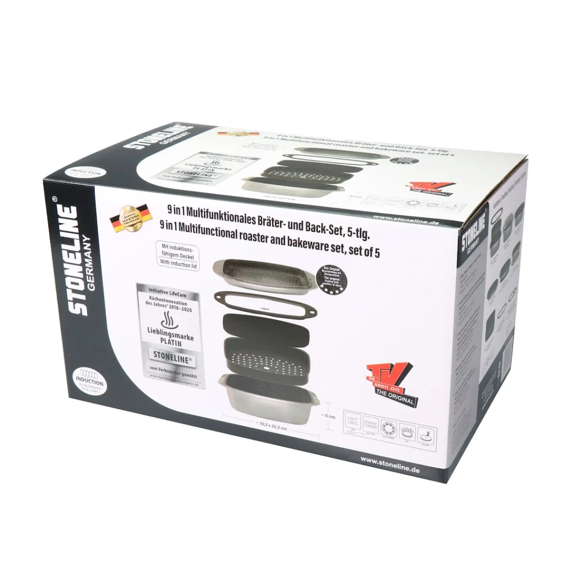 STONELINE – Das Original! Gesund fettfrei kochen und braten! Das STONELINE Koch- und Back-Set vereint mehrere Funktionen und ist für eine Vielzahl an Zubereitungsmethoden geeignet. Das Komplettset enthält alles, was du zum Kochen, Braten, Grillen, Schmoren, Dämpfen und Backen brauchst. Ideal für alle, die ihre Küche flexibel und praktisch ausstatten möchten. Aluguss Bräter – Vielseitiger Allrounder Der Aluguss Bräter bietet mit einem Volumen von knapp 6 Litern genug Platz für große Braten, Gulasch oder Eintöpfe. Er eignet sich für alle gängigen Herdarten, einschließlich Induktion, und garantiert eine gleichmäßige Wärmeverteilung. Der Bräter ist ebenso backofengeeignet, sodass du ihn nicht nur zum Braten, sondern auch für Aufläufe, Gratins oder zum Brotbacken verwenden kannst. Aluguss Deckel – Passgenau und praktisch Der Aluguss Deckel ist ebenfalls aus robustem Material gefertigt und passgenau für den Bräter. Mit einem Volumen von knapp 2 Litern kann der Deckel auch separat als Grillplatte oder im Backofen als Auflaufform verwendet werden. Die Induktionsfläche von ca. 12 cm passt perfekt auf die kleineren Kontaktflächen von Induktionsherden und das hochwertige Material sorgt für ein schnelles Erhitzen – selbstverständlich auf allen Herdarten. Aluminium-Dampfeinsatz – Dämpfen und backen Der Dampfeinsatz aus Aluminium bietet nicht nur die Möglichkeit, Gemüse, Fisch oder andere Lebensmittel schonend zu dämpfen, sondern er kann auch als Backform verwendet werden. Durch das Einlegen der Silikonmatte in den Aluminium Dämpfer besitzt dieser einen durchgängigen Boden. So lassen sich Kuchen, Aufläufe oder Brote zubereiten. Silikonmatte – Multifunktional und praktisch Die Silikonmatte lässt sich vielseitig einsetzen. Sie dient als Einlage für den Dampfeinsatz, um diesen zur Backform umzufunktionieren, kann aber auch als Backmatte verwendet werden. Einfach anstelle von Backpapier auf dem Ofenrost verwenden und du kannst deine Speisen nach der Zubereitung ohne Anhaften ablösen. Genauso einfach funktioniert es auch in der Backform: die Silikonmatte erleichtert das Herauslösen deiner Backkreationen. Glasdeckel / Schneidunterlage – Zwei in Eins Der Deckel aus gehärtetem Glas kann nicht nur zum Schließen des Bräters oder des Alugussdeckels verwendet werden, sondern dient auch als Schneidunterlage. Mit den Maßen ca. 31,5 x 20 cm bietet der Deckel eine stabile Fläche für das Schneiden, Zerkleinern, Anrichten und Servieren von Zutaten. Besonders praktisch, wenn du die Zubereitung von Speisen in deiner Küche auf verschiedenen Flächen durchführen möchtest, ohne dass eine zusätzliche Unterlage benötigt wird. Rundherum ist der Glasdeckel bzw. das Schneidebrett mit einem Silikonrand versehen, damit er beim Herunterfallen bruchsicherer ist. Dank der speziellen STONELINE-Antihaftbeschichtung lassen sich Ihre Speisen – je nach Wunsch – mit oder ohne Bratfett und Öl zubereiten und ganz ohne Ankleben aus dem Kochgeschirr lösen. Hierbei spielt es keine Rolle, ob Sie auf Glaskeramik, Induktion, Elektro oder Gas kochen. In Kochgeschirr mit der original STONELINE-Beschichtung bleiben keine hartnäckigen Reste haften und die einfache Handwäsche spart Ihnen Zeit und Mühe. Dieses 5-teilige Set besteht aus: 1 Aluguss-Bräter, ca. 39,2 x 22,2 cm, Höhe: ca. 11 cm, ca. 5,9 I, Induktionsfläche: ca. 25,2 x 14,4 cm 1 Aluguss-Deckel, ca. 39,2 x 22,2 cm, Höhe: ca. 4,3 cm, ca. 1,8 I, Induktionsfläche: ca. 12 cm 1 Aluminium-Dampfeinsatz, ca. 31,5 x 20 cm, Höhe: ca. 6,5 cm, auch als Backform verwendbar 1 Silikonmatte, ca. 31,5 x 20 cm, Höhe: ca. 1,5 cm, auch als Einlage für den Dampfeinsatz verwendbar, so dass dieser zur Backform wird 1 Glasdeckel, ca. 31,5 x 20 cm, Höhe: ca. 2 cm, auch als Schneidunterlage oder Servierplatte verwendbar Die wichtigsten Vorteile auf einen Blick: Weltweit einzige Antihaftbeschichtung mit echten Steinpartikeln Kratzfeste STONELINE-Antihaftbeschichtung Vitaminschonend kochen und braten ohne Fett und Öl Optimales Bratergebnis und kross gebratenes