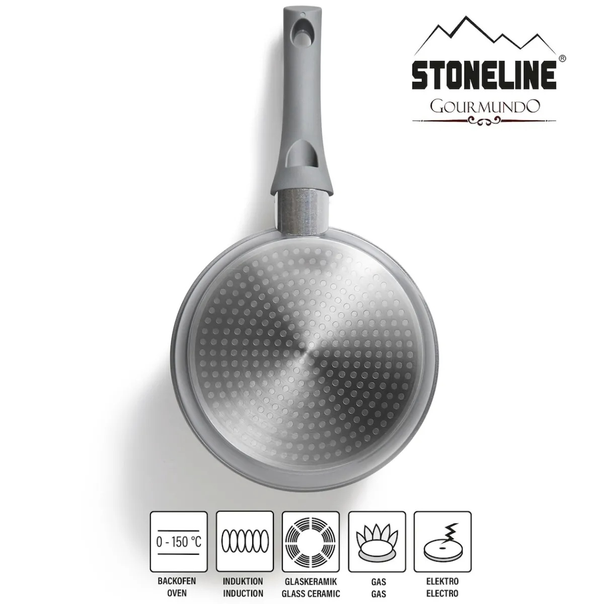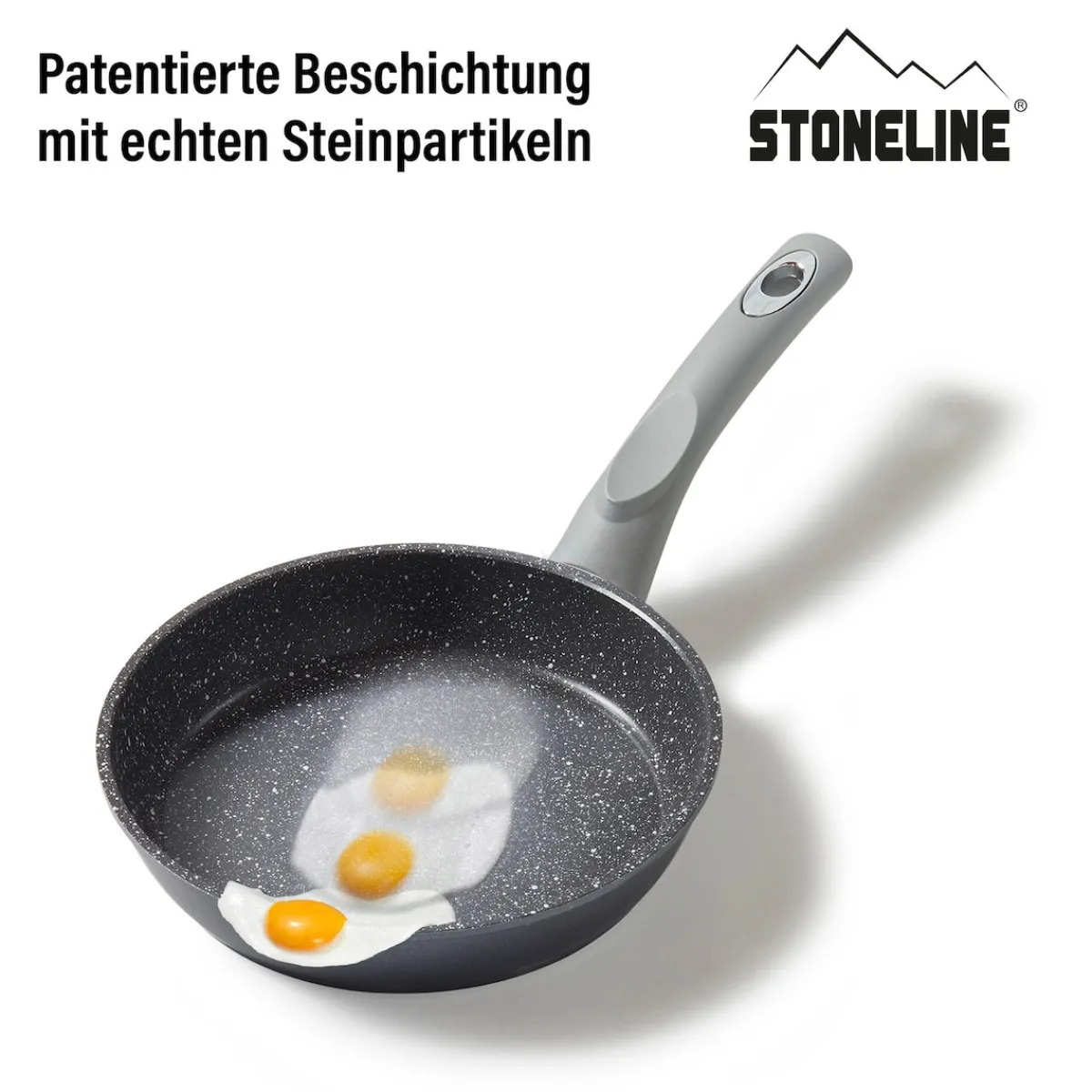 STONELINE – Das Original! Gesund fettfrei kochen und braten! Ein modernes Design in Kombination mit ergonomischen Soft-Touch-Griffen zeichnet die Bratpfannen der STONELINE Gourmundo Linie aus. Diese 18 cm Pfanne ist ein Muss in jeder Küche. Sie ist für sehr kleine Mengen optimal geeignet. Dank der speziellen STONELINE-Antihaftbeschichtung lassen sich Ihre Speisen – je nach Wunsch – mit oder ohne Bratfett und Ol zubereiten und ganz ohne Ankleben aus dem Kochgeschirr lösen. Hierbei spielt es keine Rolle, ob Sie auf Glaskeramik, Induktion, Elektro oder Gas kochen. In Pfannen mit der original STONELINE-Beschichtung bleiben keine hartnäckigen Reste haften und die einfache Handwäsche spart Ihnen Zeit und Mühe. 1 Bratpfanne Induktion, ø ca. 18 cm, Höhe: ca. 3,8 cm, ca. 0,8 l; Induktionsboden: ø ca. 14,9 cm Die wichtigsten Vorteile des STONELINE Kochgeschirrs auf einen Blick: Weltweit einzige Antihaftbeschichtung mit echten Steinpartikeln Kratzfeste STONELINE-Antihaftbeschichtung Vitaminschonend kochen und braten ohne Fett und Ol Optimales Bratergebnis und kross gebratenes Fleisch Auch für Vegetarier geeignet: Gemüse bleibt knackig und saftig Kein Anbrennen und kein Ankleben Super leicht zu reinigen Extra starker, verzugsfreier Boden Bodenstärke: ca. 4,8 mm Für alle Herdarten geeignet, auch Induktion Backofengeeignet bis 150 °C Material: Aluminiumguss Reinigungs- und Pflegetipps: Vor dem ersten Gebrauch empfehlen wir, Ihr Koch- oder Backgeschirr mit etwas Wasser und einem milden Spülmittel gründlich auszuwaschen. Verteilen Sie anschließend mit einem Papierküchentuch einige Tropfen Speiseöl auf der Beschichtung. Bei der weiteren Nutzung können Sie auf den Einsatz von Fett oder Ol verzichten! Dank dem Easy-Clean-Effekt wird die Reinigung per Hand empfohlen. Einfach mit heißem Wasser, Handspülmittel und einem weichen Schwamm auswischen.