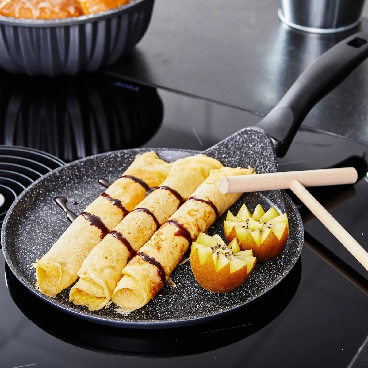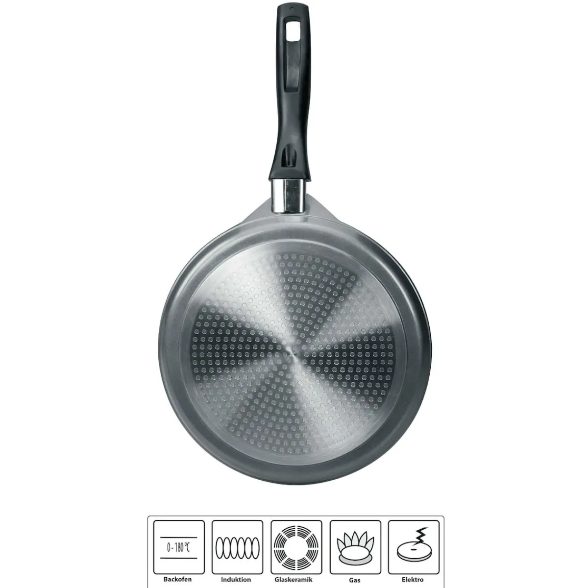 STONELINE – Das Original!Gesund fettfrei kochen und braten! Wer liebt sie nicht, diese hauchdünnen Pfannkuchen mit ihren süßen oder pikanten Belägen:Crêpes Suzette, Crêpes mit Marmelade mit Schokocreme oder Kompott – oder aber Crêpes mit Streichkäse, Champignons, Kräutern oder einer leichten Gemüse-Mousse. Die Grundlage ist ein dünner Teig, der mit dieser Crêpe-Pfanne und dem Holzschieber einfach auf der Bratfläche verteilt werden kann. Der kleine Seitenrand sorgt dafür, dass nichts ausläuft. Einfach den Teig in die Pfanne schöpfen, mit dem Teigverteiler auf der gesamten Bratfläche verteilen, braten, wenden, fertig! Dank der speziellen STONELINE-Antihaftbeschichtung lassen sich Ihre Speisen – je nach Wunsch – mit oder ohne Bratfett und Ol zubereiten und ganz ohne Ankleben aus dem Kochgeschirr lösen. Hierbei spielt es keine Rolle, ob Sie auf Glaskeramik, Induktion, Elektro oder Gas kochen. In Kochgeschirr mit der original STONELINE-Beschichtung bleiben keine hartnäckigen Reste haften und die einfache Handwäsche spart Ihnen Zeit und Mühe. 1 Crêpe-Pfanne, ø ca. 25 cm, Höhe: ca. 1,7 cm, ca. 0,7 l1 Teigverteiler aus Holz Die wichtigsten Vorteile des STONELINE Kochgeschirrs auf einen Blick: Weltweit einzige Antihaftbeschichtung mit echten Steinpartikeln Kratzfeste STONELINE-Antihaftbeschichtung Vitaminschonend kochen und braten ohne Fett und Ol Optimales Bratergebnis und kross gebratenes Fleisch Auch für Vegetarier geeignet: Gemüse bleibt knackig und saftig Kein Anbrennen und kein Ankleben Super leicht zu reinigen Extra starker, verzugfreier Boden Bodenstärke: 4,5 mm Für alle Herdarten geeignet, auch Induktion Backofengeeignet bis 180 °C Material: Aluminiumguss Reinigungs- und Pflegetipps: Vor dem ersten Gebrauch empfehlen wir, Ihr Koch- oder Backgeschirr mit etwas Wasser und einem milden Spülmittel gründlich auszuwaschen.Verteilen Sie anschließend mit einem Papierküchentuch einige Tropfen Speiseöl auf der Beschichtung.Bei der weiteren Nutzung können Sie auf den Einsatz von Fett oder Ol verzichten!Dank dem Easy-Clean-Effekt wird die Reinigung per Hand empfohlen. Einfach mit heißem Wasser, Handspülmittel und einem weichen Schwamm auswischen.