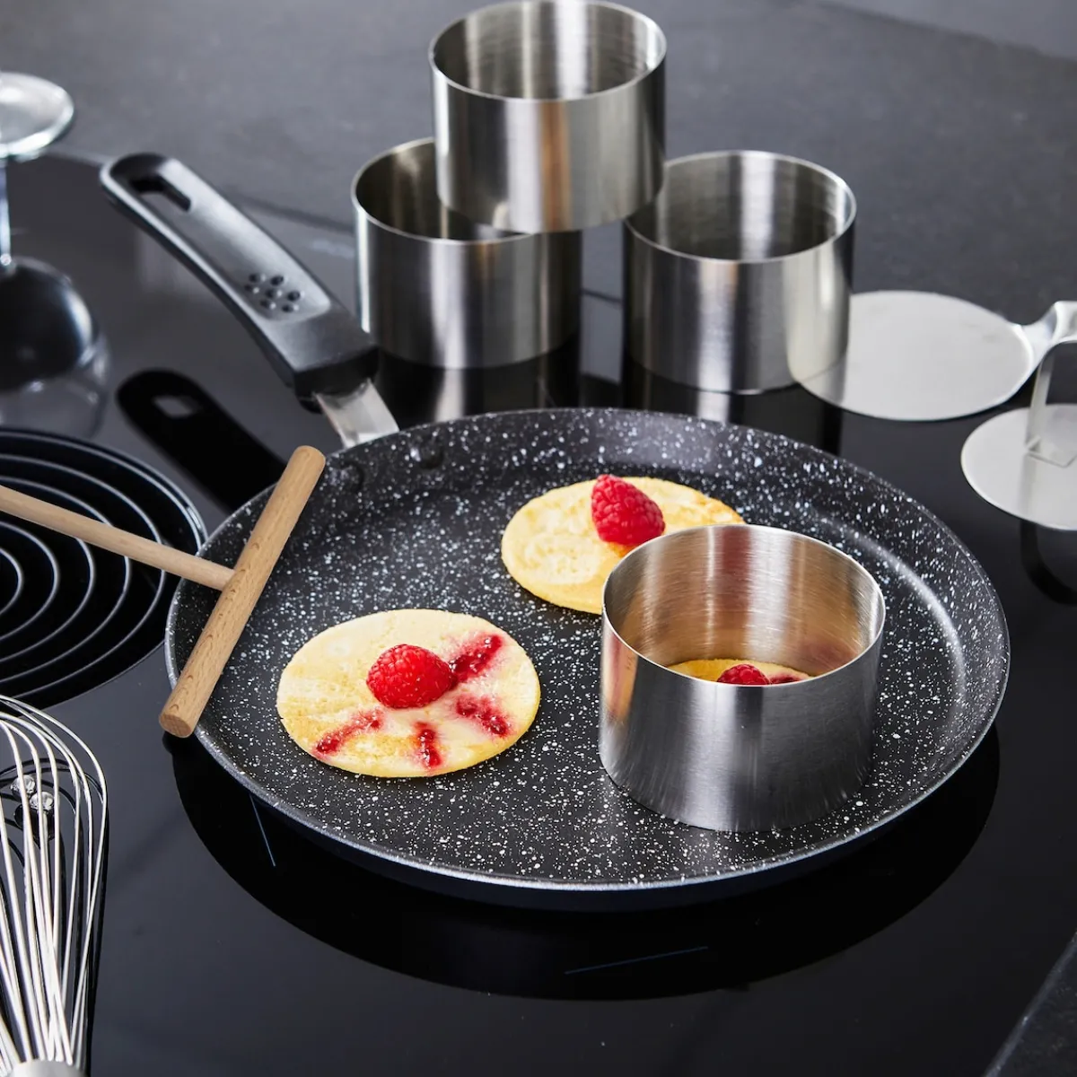 STONELINE – Das Original!Gesund fettfrei kochen und braten! Wer liebt sie nicht, diese hauchdünnen Pfannkuchen mit ihren süßen oder pikanten Belägen:Crêpes Suzette, Crêpes mit Marmelade, mit Schokocreme oder Kompott – oder aber Crêpes mit Streichkäse, Champignons, Kräutern oder einer leichten Gemüse-Mousse. Die Grundlage ist ein dünner Teig, der mit dieser Crêpe-Pfanne und dem Holzschieber einfach auf der Bratfläche verteilt werden kann. Der kleine Seitenrand sorgt dafür, dass nichts ausläuft. Einfach den Teig in die Pfanne schöpfen, mit dem Teigverteiler auf der gesamten Bratfläche verteilen, braten, wenden, fertig! Dank der speziellen STONELINE-Antihaftbeschichtung lassen sich Ihre Speisen – je nach Wunsch – mit oder ohne Bratfett und Öl zubereiten und ganz ohne Ankleben aus dem Kochgeschirr lösen. Hierbei spielt es keine Rolle, ob Sie auf Glaskeramik, Induktion, Elektro oder Gas kochen. In Kochgeschirr mit der original STONELINE-Beschichtung bleiben keine hartnäckigen Reste haften und die einfache Handwäsche spart Ihnen Zeit und Mühe. 1 Crêpe-Pfanne, ø ca. 25 cm, Höhe: ca. 2,0 cm, ca. 0,7 l, Induktionsboden: Ø ca. 19,2 cm 1 Teigverteiler aus Holz Die wichtigsten Vorteile des STONELINE Kochgeschirrs auf einen Blick: Weltweit einzige Antihaftbeschichtung mit echten Steinpartikeln Kratzfeste STONELINE-Antihaftbeschichtung Vitaminschonend kochen und braten ohne Fett und Öl Optimales Bratergebnis und kross gebratenes Fleisch Auch für Vegetarier geeignet: Gemüse bleibt knackig und saftig Kein Anbrennen und kein Ankleben Super leicht zu reinigen Extra starker, verzugsfreier Boden Bodenstärke: 3 mm Für alle Herdarten geeignet, auch Induktion Backofengeeignet bis 180 °C Material: Aluminium Reinigungs- und Pflegetipps: Vor dem ersten Gebrauch empfehlen wir, Ihr Koch- oder Backgeschirr mit etwas Wasser und einem milden Spülmittel gründlich auszuwaschen.Verteilen Sie anschließend mit einem Papierküchentuch einige Tropfen Speiseöl auf der Beschichtung.Bei der weiteren Nutzung können Sie auf den Einsatz von Fett oder Öl verzichten!Dank dem Easy-Clean-Effekt wird die Reinigung per Hand empfohlen. Einfach mit heißem Wasser, Handspülmittel und einem weichen Schwamm auswischen.