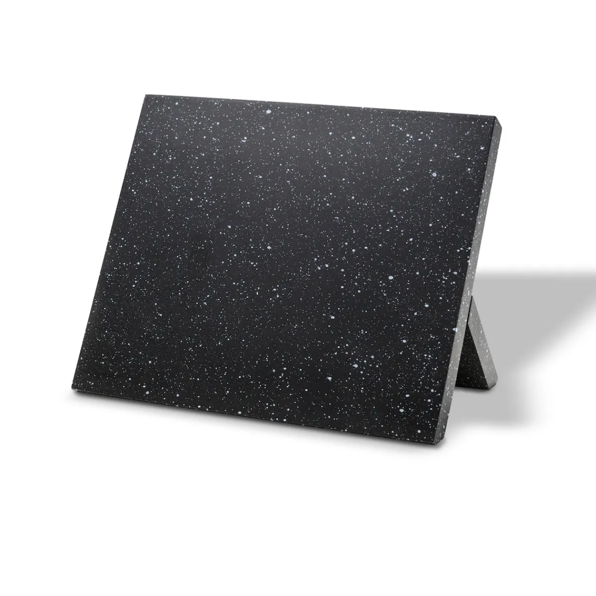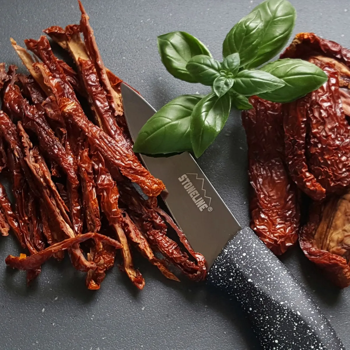 STONELINE – Das Original! Dieser Messerblock ist mit Kochmessern ausgestattet, die sich für die Verarbeitung sämtlicher Lebensmittel eignen. Dank des Magnetfelds im Messerblocks positionieren Sie Ihre Messer einfach, schnell und jederzeit griffbereit! Die rostfreien Edelstahl-Messer mit Titanbeschichtung punkten mit einer extrem scharfen Klinge. Mühelos können damit Ihre Lebensmittel zerkleinert werden. Die Messer liegen gut in der Hand, was auf den ergonomischen Griff zurückzuführen ist. Den klappbaren Ständer können Sie platzsparend in der Schublade verstauen. Dieses Set besteht aus: 1 Kochmesser, Gesamtlänge ca. 32 cm, Klingenlänge ca. 18,5 cm 1 Filet-Messer, Gesamtlänge ca. 32 cm, Klingenlänge ca. 20 cm 1 Brotmesser, Gesamtlänge ca. 31,5 cm, Klingenlänge ca. 19,5 cm 1 Universalmesser, Gesamtlänge ca. 22,5 cm, Klingenlänge ca. 11,5 cm 1 Schälmesser, Gesamtlänge ca. 19 cm, Klingenlänge ca. 8,5 cm 1 Magnet-Messerblock, ca. 25,5 x 23,3 cm Die wichtigsten Vorteile der STONELINE Edelstahlmesser auf einen Blick: Hohe Verschleiß- und Korrosionsfestigkeit dank Titanbeschichtung Extrem scharf Platzsparend verstaubar Ergonomischer Griff für eine komfortable Handhabung Mit Easy-Clean-Effekt Material: Edelstahl, PP, Holz