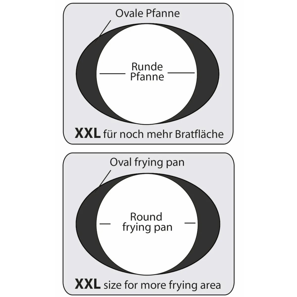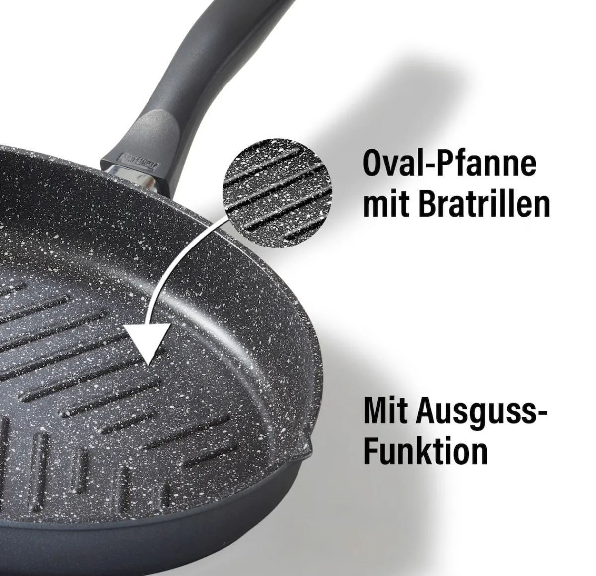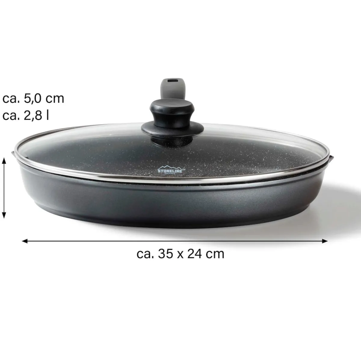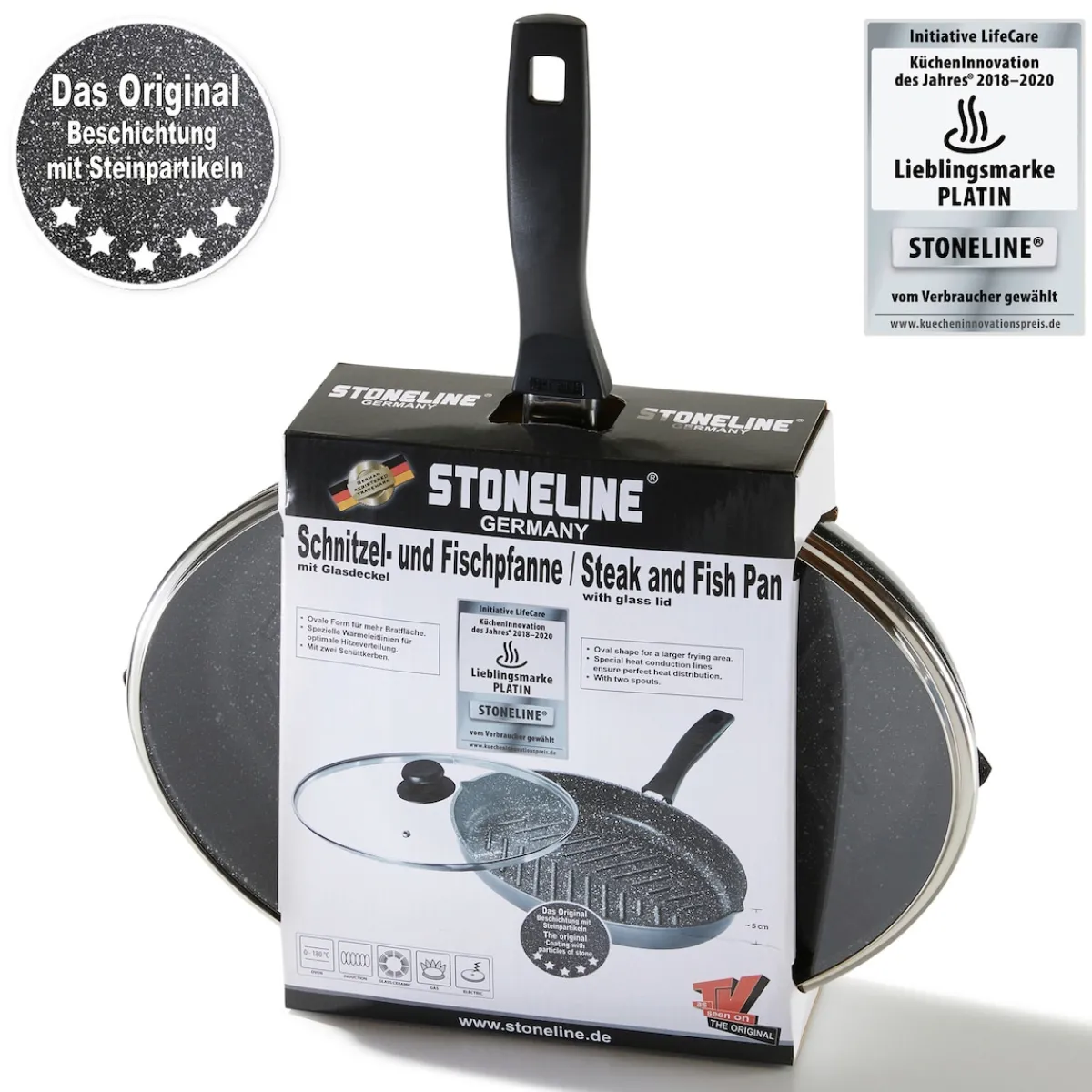 STONELINE – Das Original!Gesund fettfrei kochen und braten! Sie möchten große Wiener Schnitzel oder mehrere Rahm- oder Jägerschnitzel gleichzeitig zubereiten? Oder sich an die Zubereitung eines Zanders, einer Dorade oder anderer Speisefische wagen? Dank der ovalen Form bietet diese Fischpfanne Induktion ausreichend Platz, z. B. für mehrere Fleischstücke nebeneinander, für große Steaks wie das T-Bone-Steak, große Fischfilets und ganze Fische, die in keine runde Standardpfanne passen. Spezielle Wärmeleitlinien im Pfannenboden sorgen für die optimale Hitzeverteilung. Weiteres praktisches Extra: zwei Ausgüsse erleichtern das Abschütten von überschüssigem Fett oder Öl nach dem Anbraten. Dank der speziellen STONELINE-Antihaftbeschichtung lassen sich Ihre Speisen in der Stoneline Pfanne – je nach Wunsch – mit oder ohne Bratfett und Öl zubereiten und ganz ohne Ankleben aus dem Kochgeschirr lösen. Hierbei spielt es keine Rolle, ob Sie auf Glaskeramik, Induktion, Elektro oder Gas kochen. In Kochgeschirr mit der original STONELINE-Beschichtung bleiben keine hartnäckigen Reste haften und die einfache Handwäsche spart Ihnen Zeit und Mühe. 1 XXL Schnitzel- und Fischpfanne, ca. 35,2 x 24 cm, Höhe: ca. 5,0 cm, ca. 2,9 l, Induktionsboden: ca. 29,7 x 20 cm1 Glasdeckel, ca. 35,2 x 24,3 cm Die wichtigsten Vorteile des STONELINE Kochgeschirrs auf einen Blick: Weltweit einzige Antihaftbeschichtung mit echten Steinpartikeln Kratzfeste STONELINE-Antihaftbeschichtung Vitaminschonend kochen und braten ohne Fett und Öl Optimales Bratergebnis und kross gebratenes Fleisch Auch für Vegetarier geeignet: Gemüse bleibt knackig und saftig Kein Anbrennen und kein Ankleben Super leicht zu reinigen Extra starker, verzugsfreier Boden Bodenstärke: 4,5 mm Für alle Herdarten geeignet, auch Induktion Backofengeeignet bis 180 °C Material: Aluminiumguss Reinigungs- und Pflegetipps: Vor dem ersten Gebrauch empfehlen wir, Ihr Koch- oder Backgeschirr mit etwas Wasser und einem milden Spülmittel gründlich auszuwaschen.Verteilen Sie anschließend mit einem Papierküchentuch einige Tropfen Speiseöl auf der Beschichtung.Bei der weiteren Nutzung können Sie auf den Einsatz von Fett oder Öl verzichten!Dank dem Easy-Clean-Effekt wird die Reinigung per Hand empfohlen. Einfach mit heißem Wasser, Handspülmittel und einem weichen Schwamm auswischen.