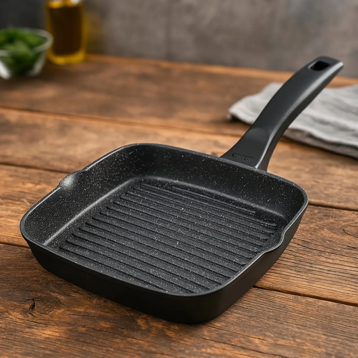 STONELINE – Das Original! Gesund fettfrei kochen und braten! Diese 16 cm Grillpfanne ist ein Muss in jeder Küche. Sie ist für kleinere Mengen optimal geeignet. Die gleichmäßige Hitzeverteilung verspricht ein sehr gutes Grillergebnis. Diese Grillpfanne bietet dank ihrer eckigen Form mehr als 30 % Bratfläche im Vergleich zu einer runden 16 cm Bratpfanne! Praktisches Detail: über 2 Ausgusslippen an den Seiten lassen sich Bratensaft oder Bratfett sauber abgießen. Dank der speziellen STONELINE-Antihaftbeschichtung lassen sich Ihre Speisen – je nach Wunsch – mit oder ohne Bratfett und Ol zubereiten und ganz ohne Ankleben aus dem Kochgeschirr lösen. Hierbei spielt es keine Rolle, ob Sie auf Glaskeramik, Induktion, Elektro oder Gas kochen. In Pfannen mit der original STONELINE-Beschichtung bleiben keine hartnäckigen Reste haften und die einfache Handwäsche spart Ihnen Zeit und Mühe. 1 Grillpfanne Induktion, ca. 16 x 16 cm, Höhe: ca. 3,3 cm, ca. 0,6 l; Induktionsboden: Ø ca. 11,7 cm Die wichtigsten Vorteile des STONELINE Kochgeschirrs auf einen Blick: Weltweit einzige Antihaftbeschichtung mit echten Steinpartikeln Kratzfeste STONELINE-Antihaftbeschichtung Vitaminschonend kochen und braten ohne Fett und Ol Optimales Bratergebnis und kross gebratenes Fleisch Auch für Vegetarier geeignet: Gemüse bleibt knackig und saftig Kein Anbrennen und kein Ankleben Super leicht zu reinigen Extra starker, verzugsfreier Boden Bodenstärke: ca. 4,7 mm Für alle Herdarten geeignet, auch Induktion Backofengeeignet bis 180 °C Material: Aluminiumguss Ganzjähriges Grillvergnügen: Sorgen Sie mit unseren Grillpfannen für eine leckere Abwechslung in Ihre Küche – egal bei welchem Wetter. Die Grillrippen am Pfannenboden zaubern markante Grillstreifen auf Ihre Lebensmittel. überschüssiges Fett und Bratflüssigkeit sammelt sich am Boden der Rillen, während das Bratgut erhöht liegt. Egal ob Steaks, Gemüsestreifen, Fischfilets oder Garnelen, mit dieser Grillpfanne schmeckt es herrlich nach Sommer. Unser Tipp: Steaks nach dem Anbraten noch im Backofen durchziehen lassen oder mit Käse überbacken. Reinigungs- und Pflegetipps: Vor dem ersten Gebrauch empfehlen wir, Ihr Koch- oder Backgeschirr mit etwas Wasser und einem milden Spülmittel gründlich auszuwaschen. Verteilen Sie anschließend mit einem Papierküchentuch einige Tropfen Speiseöl auf der Beschichtung. Bei der weiteren Nutzung können Sie auf den Einsatz von Fett oder Ol verzichten! Dank dem Easy-Clean-Effekt wird die Reinigung per Hand empfohlen. Einfach mit heißem Wasser, Handspülmittel und einem weichen Schwamm auswischen.