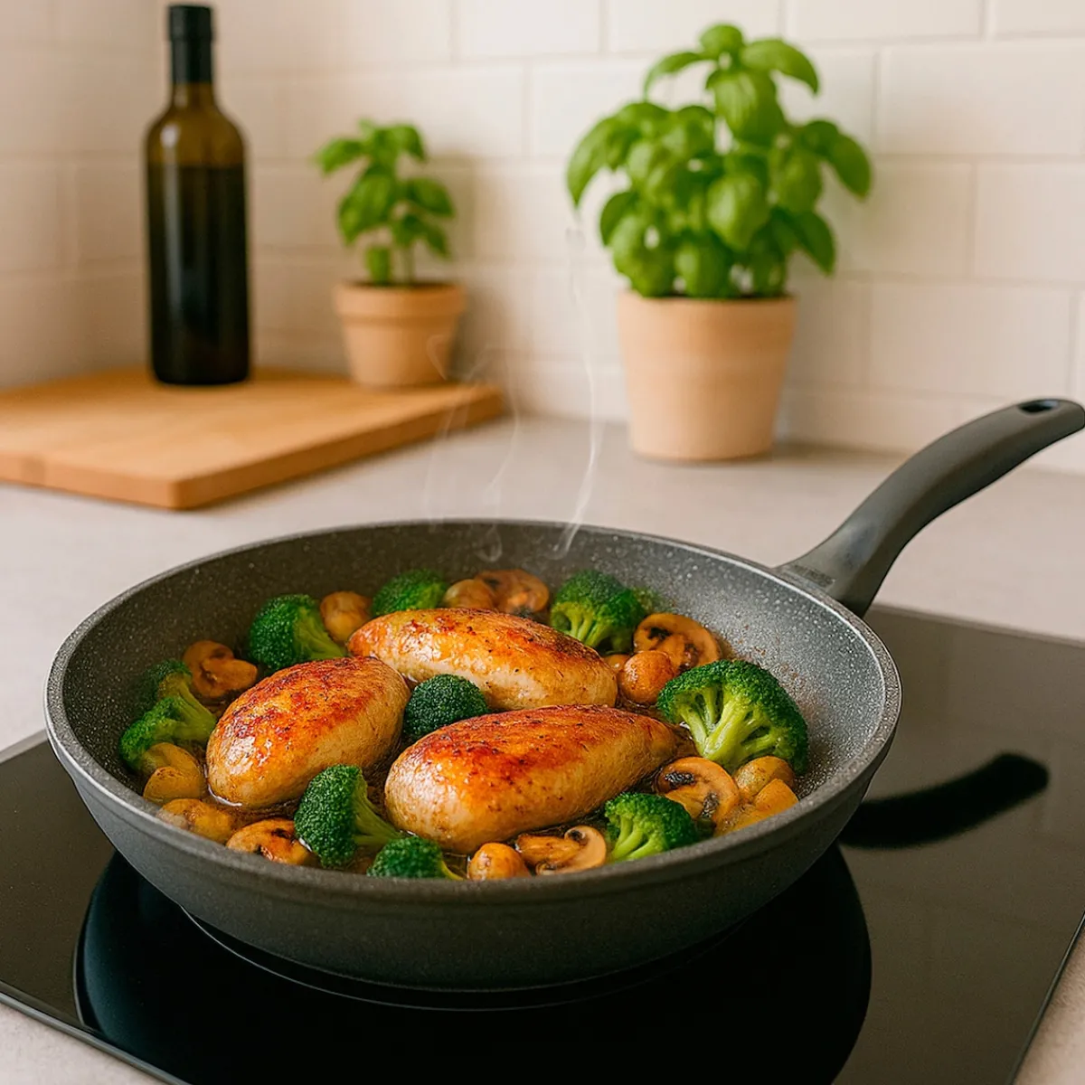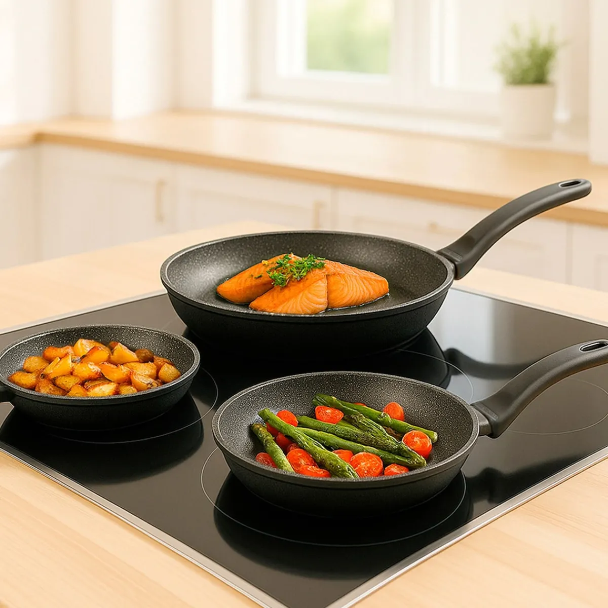 STONELINE Made in Germany!Gesund fettfrei kochen und braten! Ihre neuen Lieblings-Pfannen! Drei Pfannen – ein Genuss! Entdecken Sie die Freude am Kochen mit den drei Antihaft Pfannen mit einem Durchmesser von 28, 24 und 20 cm. Bereiten Sie in der kleinen Pfanne eine Einzelportion zu, in der mittleren leckere Spiegeleier und in der großen Pfanne mit 28 cm köstliche Pfannkuchen. Mit diesen drei Pfannen haben Sie immer die perfekte Größe für Ihre Lieblingsgerichte. Dank der speziellen STONELINE-Antihaftbeschichtung lassen sich Ihre Speisen – je nach Wunsch – mit oder ohne Bratfett und Öl zubereiten und ganz ohne Ankleben aus dem Kochgeschirr lösen. Hierbei spielt es keine Rolle, ob Sie auf Glaskeramik, Induktion, Elektro oder Gas kochen.In Kochgeschirr mit der original STONELINE-Beschichtung bleiben keine hartnäckigen Reste haften und die einfache Handwäsche spart Ihnen Zeit und Mühe. Dieses 3 teilige Set besteht aus: 1 Bratpfanne, ø ca. 20 cm, Höhe: ca. 4,3 cm, ca. 1,0 l, Induktionsboden: ø ca. 13,4 cm 1 Bratpfanne, ø ca. 24 cm, Höhe: ca. 4,6 cm, ca. 1,4 l, Induktionsboden: ø ca. 16 cm 1 Bratpfanne, ø ca. 28 cm, Höhe: ca. 5,1 cm, ca. 2,4 l, Induktionsboden: ø ca. 19,5 cm Die wichtigsten Vorteile des STONELINE Kochgeschirrs auf einen Blick: Weltweit einzige Antihaftbeschichtung mit echten Steinpartikeln Kratzfeste STONELINE-Antihaftbeschichtung Vitaminschonend kochen und braten ohne Fett und Öl Optimales Bratergebnis und kross gebratenes Fleisch Auch für Vegetarier geeignet: Gemüse bleibt knackig und saftig Kein Anbrennen und kein Ankleben Super leicht zu reinigen Extra starker, verzugsfreier Boden Bodenstärke: 4,5 mm Für alle Herdarten geeignet, auch Induktion Backofengeeignet bis 180 °C Material: Aluminium geschmiedet Reinigungs- und Pflegetipps: Vor dem ersten Gebrauch empfehlen wir, Ihr Koch- oder Backgeschirr mit etwas Wasser und einem milden Spülmittel gründlich auszuwaschen.Verteilen Sie anschließend mit einem Papierküchentuch einige Tropfen Speiseöl auf der Beschichtung.Bei der weiteren Nutzung können Sie auf den Einsatz von Fett oder Öl verzichten!Dank dem Easy-Clean-Effekt wird die Reinigung per Hand empfohlen. Einfach mit heißem Wasser, Handspülmittel und einem weichen Schwamm auswischen.