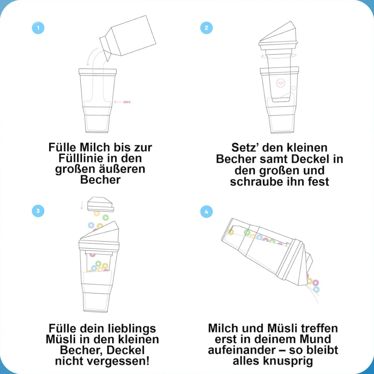 CrunchCup by STONELINE – Das Original! Mit dem CrunchCup erhältst du ein praktisches und durchdachtes 2-in-1 System, das es dir ermöglicht, knuspriges Müsli oder Snacks jederzeit und überall zu genießen. Durch das innovative Design und das clevere Zwei-Kammer-System kannst du Milch und Trockenzutaten sicher und getrennt aufbewahren, bis du sie nach Belieben vermischen möchtest – und das ganz ohne Schüssel und Löffel! Kein Verschütten, keine Unordnung – einfach kippen, direkt im Mund mischen und genießen! Perfekt für die morgendliche Routine, einen schnellen Snack zwischendurch, im Büro, in der Schule, beim Sport, auf Reisen oder beim Camping. Die einfach Handhabung macht den CrunchCup zu einem praktischen Alltagshelfer – für dich, für mich, für alle! Egal ob Erwachsene oder Kinder, der CrunchCup ist für alle leicht zu verwenden. So funktioniert dein neuer Lieblings-Müslibecher: Fülle Milch oder eine andere Flüssigkeit bis zur Markierung in den äußeren Behälter, verschraube den inneren Behälter mit deinen Trockenzutaten wie Müsli, Nüsse oder Toppings deiner Wahl und schon bist du bereit. Mit einer einfachen Kippbewegung des Bechers mischst du den Inhalt beider Behälter direkt in deinem Mund – schnell, praktisch und zuverlässig. Die Menge an Milch lässt sich dabei ganz einfach steuern: Halte einen Finger auf das Luftloch im Deckel und reguliere so, wie viel Milch herausfließt – ganz nach deinem Wunsch! Der CrunchCup bietet auch viele kreative Möglichkeiten für erfrischende Getränke. Probiere doch mal eine frische Erdbeerbowle: Bewahre die Früchte im inneren Behälter auf und halte die Flüssigkeit im äußeren Behälter. Und wenn du noch mehr Abwechslung willst, versuche doch eine Kombination aus Trinkjoghurt außen und Fruchtpüree innen oder einen Protein-Shake mit Haferflocken. Der CrunchCup ist extrem vielseitig und lässt sich für unzählige Snacks und Drinks einsetzen! Probiere es aus – du wirst erstaunt sein, wie unkompliziert der CrunchCup funktioniert! 1 CrunchCup für 2 Portionen, Höhe gesamt mit Deckel: ca. 22 cm, Volumen: Außenbehälter (Flüssigkeit) bis zur max. Fülllinie: ca. 260 ml, Innenbehälter (Trockenzutaten): ca. 250 ml In der Farbe: Blau Die wichtigsten Vorteile auf einen Blick: Ideal für ein schnelles, ausgewogenes Frühstück unterwegs oder einen Zwischensnack Einfaches Mischen von Flüssigkeit und Trockenzutaten direkt im Mund – kein Löffel oder Schüssel notwendig Füllmenge ausreichend für zwei Portionen Vielseitig einsetzbar für Müsli, Milchshakes, Früchtebowle, Cocktails und vieles mehr Sichere, separate Aufbewahrung von Flüssigkeiten und Trockenzutaten Kompakt, praktisch und leicht zu handhaben Einfach zu reinigen, spülmaschinengeeignet Behälter aus hochwertigem, robustem Kunststoff BPA-frei Geruchsneutral Geschmacksneutral Recycelbar Material: Kunststoff, Platinsilikon