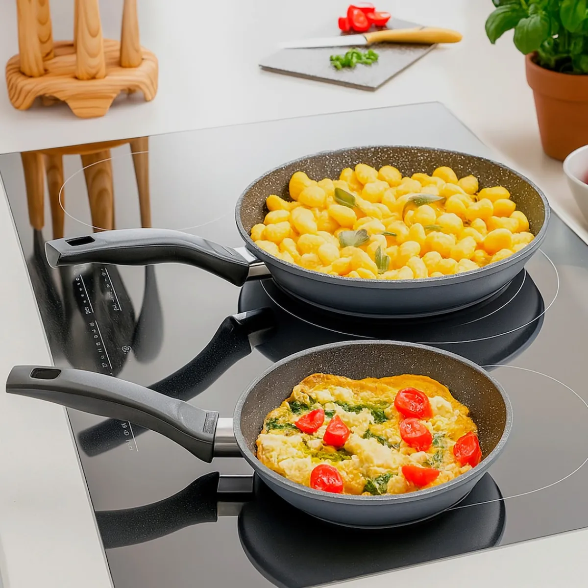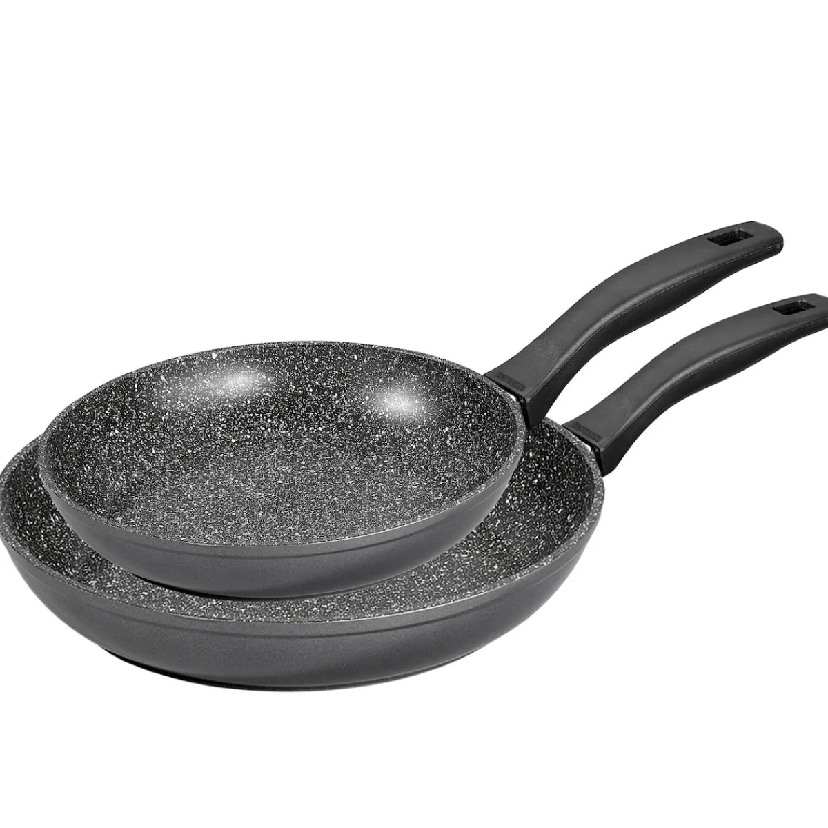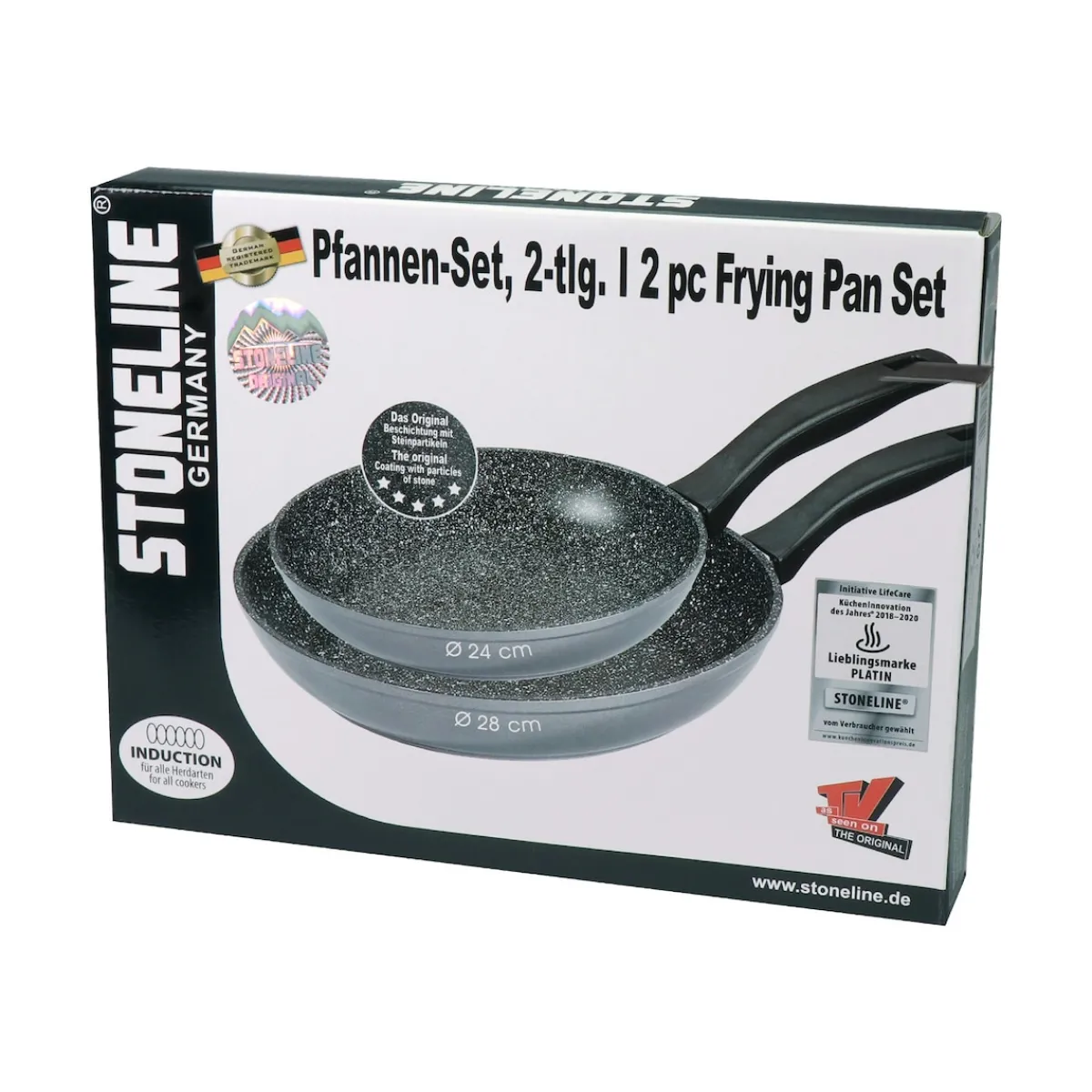 STONELINE – Das Original!Gesund fettfrei kochen und braten! Dieses Pfannen-Set gehört in jede Küche. Zaubern Sie knusprige Bratkartoffeln, leckeres Gemüse, luftige Eierspeisen und kross gebratenes Fleisch und verwenden Sie dazu, je nach Bedarf, die kleinere oder die größere Pfanne! Dank der speziellen STONELINE-Antihaftbeschichtung lassen sich Ihre Speisen – je nach Wunsch – mit oder ohne Bratfett und Ol zubereiten und ganz ohne Ankleben aus dem Kochgeschirr lösen. Hierbei spielt es keine Rolle, ob Sie auf Glaskeramik, Induktion, Elektro oder Gas kochen. In Kochgeschirr mit der original STONELINE-Beschichtung bleiben keine hartnäckigen Reste haften und die einfache Handwäsche spart Ihnen Zeit und Mühe. Dieses 2-teilige Set besteht aus: 1 Bratpfanne, ø ca. 24 cm, Höhe: ca. 4,4 cm, ca. 1,5 l1 Bratpfanne ø ca. 28 cm, Höhe: ca. 4,7 cm, ca. 2,3 l Die wichtigsten Vorteile des STONELINE Kochgeschirrs auf einen Blick: Weltweit einzige Antihaftbeschichtung mit echten Steinpartikeln Kratzfeste STONELINE-Antihaftbeschichtung Vitaminschonend kochen und braten ohne Fett und Ol Optimales Bratergebnis und kross gebratenes Fleisch Auch für Vegetarier geeignet: Gemüse bleibt knackig und saftig Kein Anbrennen und kein Ankleben Super leicht zu reinigen Extra starker, verzugsfreier Boden Bodenstärke: 4,5 mm Für alle Herdarten geeignet, auch Induktion Backofengeeignet bis 180 °C Material: Aluminiumguss Reinigungs- und Pflegetipps: Vor dem ersten Gebrauch empfehlen wir, Ihr Koch- oder Backgeschirr mit etwas Wasser und einem milden Spülmittel gründlich auszuwaschen.Verteilen Sie anschließend mit einem Papierküchentuch einige Tropfen Speiseöl auf der Beschichtung.Bei der weiteren Nutzung können Sie auf den Einsatz von Fett oder Ol verzichten!Dank dem Easy-Clean-Effekt wird die Reinigung per Hand empfohlen. Einfach mit heißem Wasser, Handspülmittel und einem weichen Schwamm auswischen.