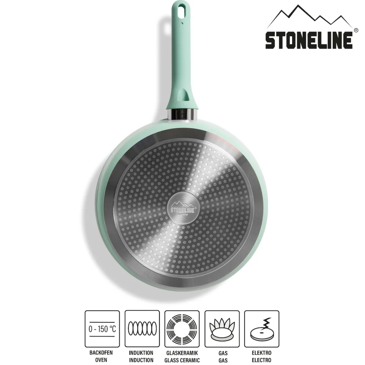 STONELINE – Das Original!Gesund fettfrei kochen und braten! Natürliche Frische und Klarheit als stilvoller Akzent. Verleihe deiner Küche einen frischen, modernen Look mit der STONELINE Schmorpfanne in der trendigen Farbe Mint. Der elegante Übergang von Weiß zu Mint setzt nicht nur stylische Akzente, sondern bringt auch eine natürliche Frische in deine Küche. Mit diesem Set machst du nicht nur dein Kochvergnügen bunter – du setzt auch ein Statement für modernes Design und kreative Gerichte! Die Universalpfanne ist der perfekte Küchenhelfer für jeden Anlass. Egal, ob du schnell etwas braten oder ein aufwendigeres Gericht zaubern möchtest – mit der praktischen Antihaft Pfanne mit Deckel hast du immer das richtige Kochgeschirr zur Hand und die Zubereitung deiner Lieblingsgerichte macht doppelt soviel Spaß. Mit dem extra hohen Rand von 7,6 cm und über 4 Liter Fassungsvermögen eignet sie sich hervorragend für alle Brat- und Schmorgerichte und lässt sich auch für Gerichte nutzen, die etwas mehr Platz brauchen. Der Glasdeckel mit Platinsilikonrand ist eine großartige Ergänzung zu deinem Kochgeschirr. Der Platinsilikonrand schützt nicht nur die Antihaftbeschichtung deiner Pfanne, sondern sorgt auch dafür, dass der Deckel bruchsicherer ist. Durch den gut schließenden Rand wird Energie effizienter genutzt und das Kochen noch schneller. Zudem bieten der Deckel eine praktische Ausschütt-Funktion, die das Abgießen von Flüssigkeiten erleichtert – ganz ohne zusätzliches Sieb. Der Knauf des Deckels bleibt angenehm kühl, damit du dich während des Kochvorgangs nicht verbrennst. So wird das Kochen noch komfortabler und sicherer! Mit dieser Pfanne kannst du dich auf jede Mahlzeit freuen, die du mit Liebe und Kreativität zubereitest. Sie bringt nicht nur Stil in deine Küche, sondern sorgt auch dafür, dass du dich beim Kochen voll und ganz auf den Geschmack konzentrieren kannst. Hol dir das Set und genieße das Kochen in vollen Zügen! Dank der speziellen STONELINE Antihaftbeschichtung in Goldoptik kannst du deine Speisen in der Pfanne – je nach Wunsch – mit oder ohne Bratfett und Ol zubereiten und sie ganz ohne Ankleben aus dem Kochgeschirr lösen. Es spielt keine Rolle, ob du auf Glaskeramik, Induktion, Elektro oder Gas kochst. In der Pfanne mit der original STONELINE Antihaftbeschichtung bleiben keine hartnäckigen Reste haften und die einfache Handwäsche spart dir Zeit und Mühe. 1 Schmorpfanne, ø ca. 28 cm, Höhe: ca. 7,6 cm, ca. 4,1 l, Induktionsboden: ø ca. 20,7 cm1 Glasdeckel, ø ca. 28 cm In der Farbe: Mint Die wichtigsten Vorteile auf einen Blick: Weltweit einzige Antihaftbeschichtung mit echten Steinpartikeln Kratzfeste STONELINE-Antihaftbeschichtung Glasdeckel mit Edelstahlrand Vitaminschonend kochen und braten ohne Fett und Ol Optimales Bratergebnis und kross gebratenes Fleisch Auch für Vegetarier geeignet: Gemüse bleibt knackig und saftig Kein Anbrennen und kein Ankleben Super leicht zu reinigen dank Easy-Clean Effekt Extra starker, verzugsfreier Boden Bodenstärke: ca. 4 mm Für alle Herdarten geeignet, auch Induktion Backofengeeignet bis 150 °C Material: Aluminium Reinigungs- und Pflegetipps: Vor dem ersten Gebrauch empfehlen wir, dein Koch- oder Backgeschirr mit etwas Wasser und einem milden Spülmittel gründlich auszuwaschen. Verteile anschließend mit einem Papierküchentuch einige Tropfen Speiseöl auf der Beschichtung.Bei der weiteren Nutzung kannst du auf den Einsatz von Fett oder Ol verzichten!Dank dem Easy-Clean-Effekt wird die Reinigung per Hand empfohlen. Einfach mit heißem Wasser, Handspülmittel und einem weichen Schwamm auswischen.