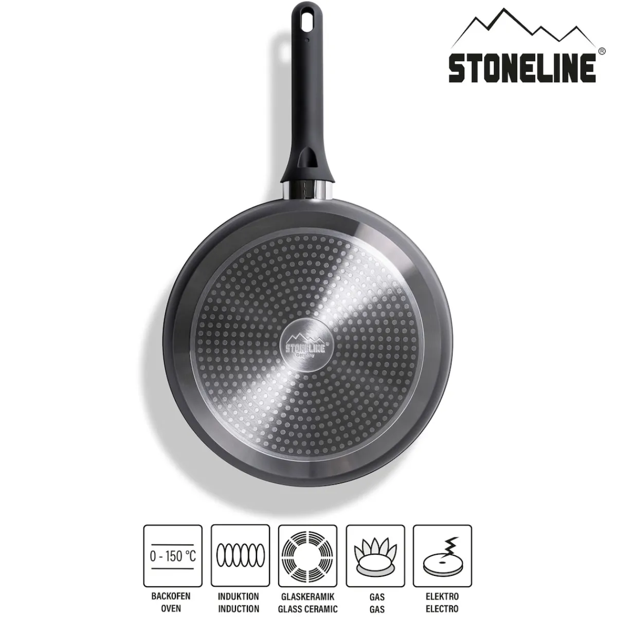 STONELINE – Das Original!Gesund fettfrei kochen und braten! Eleganz und Leidenschaft. Verleihe deiner Küche einen modernen, edlen Touch mit der STONELINE Schmorpfanne in Mattschwarz. Die eleganten Roségold-Details an dem Deckel und den Griffen setzen stilvolle Akzente und bringen einen Hauch von Luxus in deine Küche. Die einzigartige Farbkombination von Mattschwarz und Roségold vereint schlichte Eleganz mit einem modernen, luxuriösen Design. Mit diesem Set machst du nicht nur dein Kochen noch mehr zum Erlebnis, sondern setzt auch ein Statement für modernes Design und stilvolles Kochen. Hol dir das perfekte Zusammenspiel aus Funktion und Ästhetik und lass deine kulinarischen Kreationen noch mehr glänzen! Die Universalpfanne ist der perfekte Küchenhelfer für jeden Anlass. Egal, ob du schnell etwas braten oder ein aufwendigeres Gericht zaubern möchtest – mit der praktischen Antihaft Pfanne mit Deckel hast du immer das richtige Kochgeschirr zur Hand und die Zubereitung deiner Lieblingsgerichte macht doppelt soviel Spaß. Mit dem extra hohen Rand von 7,6 cm und über 4 Liter Fassungsvermögen eignet sie sich hervorragend für alle Brat- und Schmorgerichte und lässt sich auch für Gerichte nutzen, die etwas mehr Platz brauchen. Der Glasdeckel mit Edelstahlrand in Roségold ist eine großartige Ergänzung zu deinem Kochgeschirr. Der Knauf des Deckels bleibt angenehm kühl, damit du dich während des Kochvorgangs nicht verbrennst. So wird das Kochen noch komfortabler und sicherer! Mit dieser Pfanne kannst du dich auf jede Mahlzeit freuen, die du mit Liebe und Kreativität zubereitest. Sie bringt nicht nur Stil in deine Küche, sondern sorgt auch dafür, dass du dich beim Kochen voll und ganz auf den Geschmack konzentrieren kannst. Hol dir das Set und genieße das Kochen in vollen Zügen! Dank der speziellen STONELINE Antihaftbeschichtung in Goldoptik kannst du deine Speisen in der Pfanne – je nach Wunsch – mit oder ohne Bratfett und Ol zubereiten und sie ganz ohne Ankleben aus dem Kochgeschirr lösen. Es spielt keine Rolle, ob du auf Glaskeramik, Induktion, Elektro oder Gas kochst. In der Pfanne mit der original STONELINE Antihaftbeschichtung bleiben keine hartnäckigen Reste haften und die einfache Handwäsche spart dir Zeit und Mühe. 1 Schmorpfanne, ø ca. 28 cm, Höhe: ca. 7,6 cm, ca. 4,1 l, Induktionsboden: ø ca. 20,7 cm1 Glasdeckel, ø ca. 28 cm In der Farbe: Schwarz / Roségold Die wichtigsten Vorteile auf einen Blick: Weltweit einzige Antihaftbeschichtung mit echten Steinpartikeln Kratzfeste STONELINE-Antihaftbeschichtung Glasdeckel mit Edelstahlrand Vitaminschonend kochen und braten ohne Fett und Ol Optimales Bratergebnis und kross gebratenes Fleisch Auch für Vegetarier geeignet: Gemüse bleibt knackig und saftig Kein Anbrennen und kein Ankleben Super leicht zu reinigen dank Easy-Clean Effekt Extra starker, verzugsfreier Boden Bodenstärke: ca. 4 mm Für alle Herdarten geeignet, auch Induktion Backofengeeignet bis 150 °C Material: Aluminium Reinigungs- und Pflegetipps: Vor dem ersten Gebrauch empfehlen wir, dein Koch- oder Backgeschirr mit etwas Wasser und einem milden Spülmittel gründlich auszuwaschen. Verteile anschließend mit einem Papierküchentuch einige Tropfen Speiseöl auf der Beschichtung.Bei der weiteren Nutzung kannst du auf den Einsatz von Fett oder Ol verzichten!Dank dem Easy-Clean-Effekt wird die Reinigung per Hand empfohlen. Einfach mit heißem Wasser, Handspülmittel und einem weichen Schwamm auswischen.