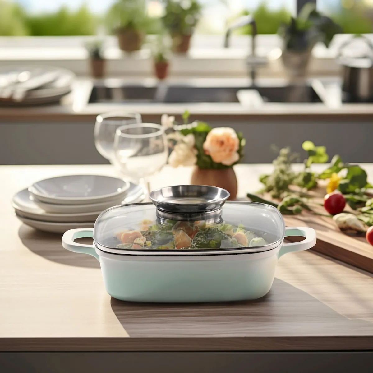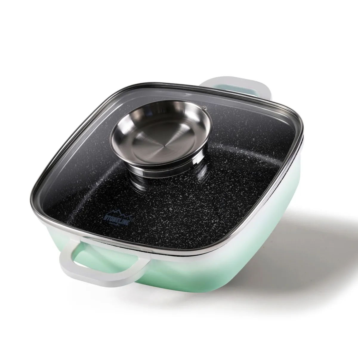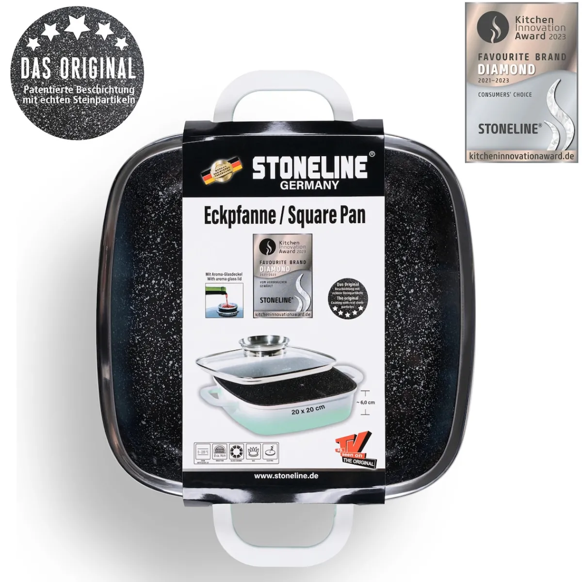 STONELINE – Das Original!Gesund fettfrei kochen und braten!Natürliche Frische und Klarheit als stilvoller Akzent.Bringen Sie neuen Schwung in Ihre Küche, mit der Eckpfanne in der fröhlichen und belebenden Farbe Mint. Der fließende Verlauf von Weiß in Mint bietet die optimale Balance zwischen Ausgefallenheit und modernem Design. Zeigen Sie Mut zur Farbe und erleben Sie pures Kochvergnügen. Diese Eckpfanne lässt sich multifunktional einsetzen: Egal, ob Sie Fleisch anbraten, ein Filet garen, einen Braten oder einen Auflauf im Backofen schmoren möchten, mit dieser Pfanne gelingt Ihnen einfach alles. Die Bratpfanne ist eckig damit sich eine zusätzliche Bratfläche von mehr als 25 % gegenüber einer runden Pfanne ergibt. Diese eckige Pfanne ist ein Muss für jeden Küchenhaushalt. Der einzigartige Aroma-Glasdeckel ermöglicht eine dosierte Zugabe von Flüssigkeiten wie z. B. Wein, flüssige Gewürze oder andere Essenzen über den Deckelknauf. So erhalten Ihre verfeinerten Speisen den unverkennbaren Geschmack der zugegebenen Aromen.Die Eckpfanne ist bis 220 °C backofengeeignet und mit der bewährten STONELINE Antihaftbeschichtung ausgestattet. Zum Herausholen aus dem Ofen ziehen Sie einfach die mitgelieferten Thermo-Schutzhüllen über die Griffe.Hierbei spielt es keine Rolle, ob Sie auf Glaskeramik, Induktion, Elektro oder Gas kochen. In der Stoneline Eckpfanne mit der original STONELINE-Beschichtung bleiben keine hartnäckigen Reste haften und die einfache Handwäsche spart Ihnen Zeit und Mühe.1 Eckpfanne Induktion, ca. 20 x 20 cm, Höhe: ca. 6,0 cm, ca. 1,9 l, Induktionsboden: ø ca. 14 cm1 Aromaglasdeckel, ca. 20 x 20 cm2 ThermogriffschützerIn der Farbe: MintDie wichtigsten Vorteile des STONELINE Kochgeschirrs auf einen Blick:Frische und moderne Eckpfanne in der Farbe MintWeltweit einzige Antihaftbeschichtung mit echten Steinpartikeln Kratzfeste STONELINE-AntihaftbeschichtungOptimales Bratergebnis und kross gebratenes FleischBester GeschmackVitaminschonend kochen und braten ohne Fett und ÖlKein Anbrennen und kein AnklebenSuper leicht zu reinigenFür alle Herdarten geeignet, auch InduktionExtra starker, verzugsfreier BodenBodenstärke 5,3 mmBackofengeeignet bis 220 °C (ohne Deckel, ohne Thermogriffschützer) / 180 °C (mit Deckel, ohne Thermogriffschützer)Material: AluminiumgussReinigungs- und Pflegetipps:Vor dem ersten Gebrauch empfehlen wir, Ihr Kochgeschirr mit etwas Wasser und einem milden Spülmittel gründlich auszuwaschen. Verteilen Sie anschließend mit einem Papierküchentuch einige Tropfen Speiseöl auf der Beschichtung.Bei der weiteren Nutzung können Sie auf den Einsatz von Fett oder Öl verzichten!Dank dem Easy-Clean-Effekt wird die Reinigung per Hand empfohlen. Einfach mit heißem Wasser, Handspülmittel und einem weichen Schwamm auswischen.
