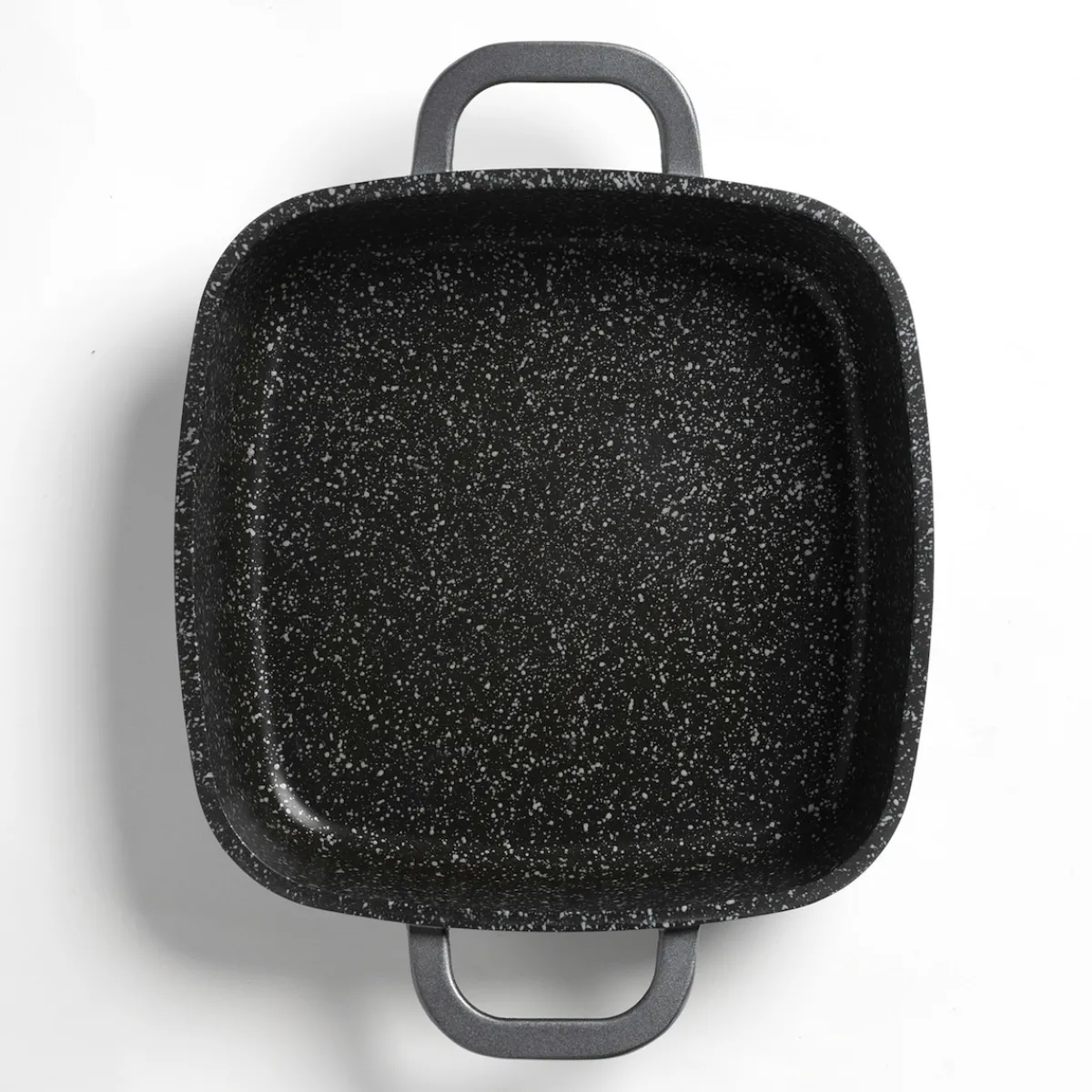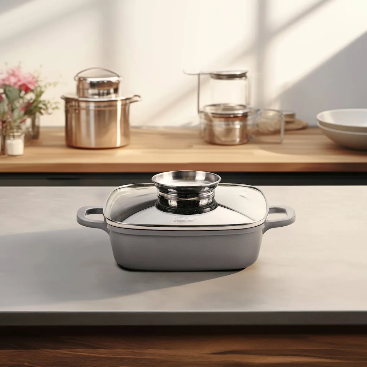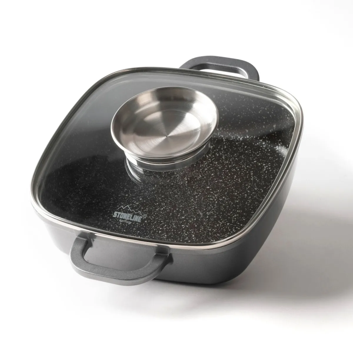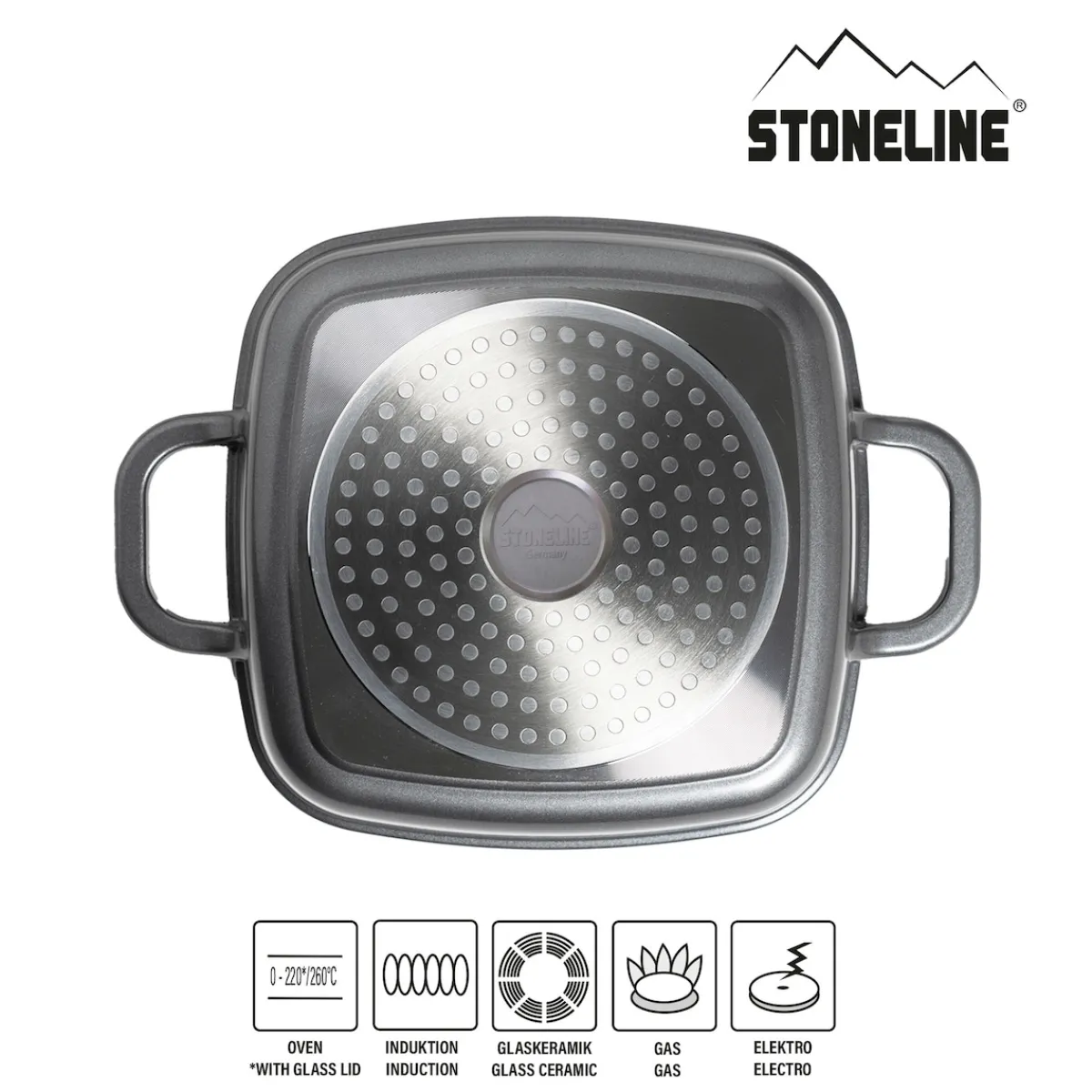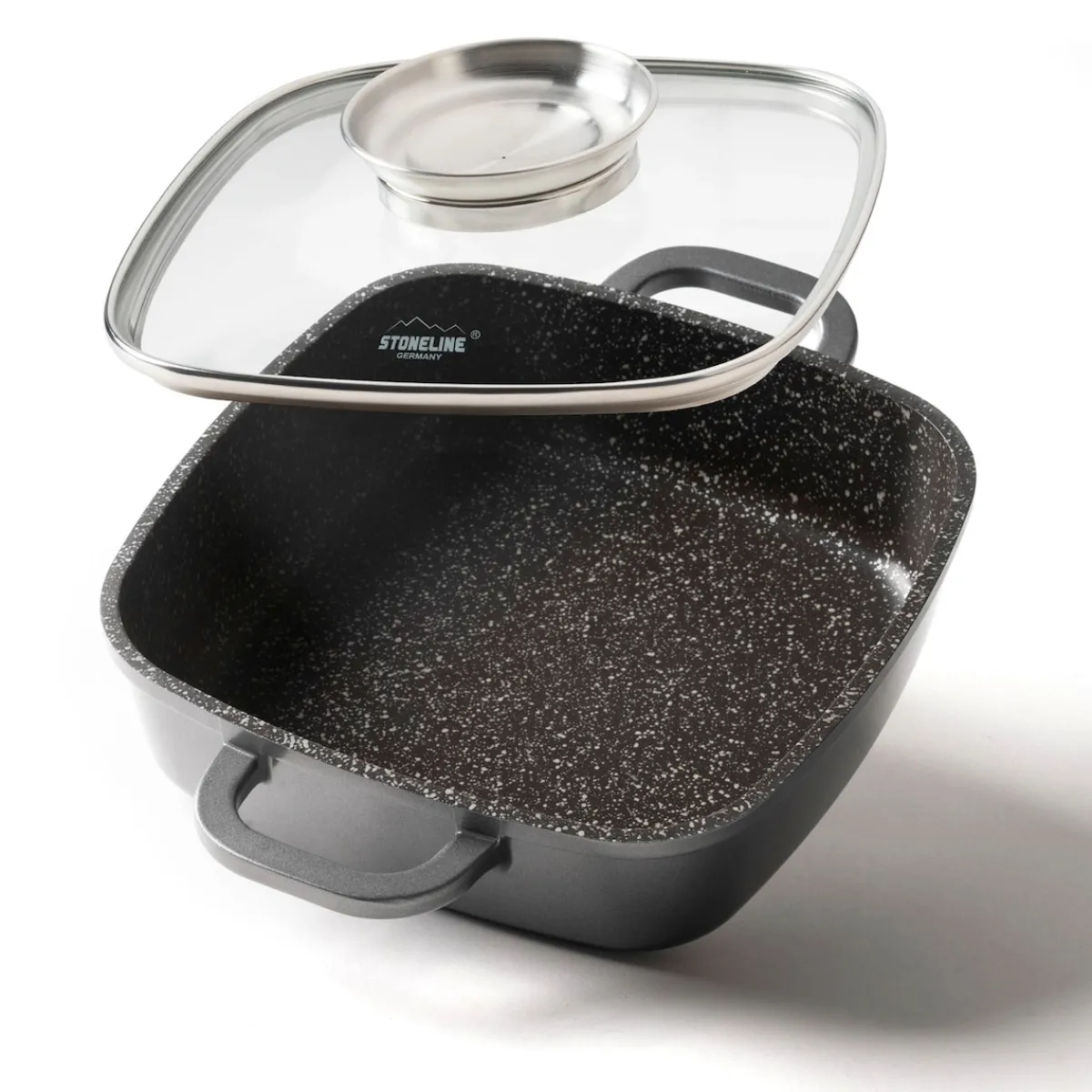 STONELINE – Das Original! Gesund fettfrei kochen und braten! Diese Eckpfanne lässt sich multifunktional einsetzen: Egal, ob Sie Fleisch anbraten, ein Filet garen, einen Braten oder einen Auflauf im Backofen schmoren möchten, mit dieser Pfanne gelingt Ihnen einfach alles. Die Bratpfanne ist eckig damit sich eine zusätzliche Bratfläche von mehr als 25 % gegenüber einer runden Pfanne ergibt. Diese eckige Pfanne ist ein Muss für jeden Küchenhaushalt. Der einzigartige Aroma-Glasdeckel ermöglicht eine dosierte Zugabe von Flüssigkeiten wie z. B. Wein, flüssige Gewürze oder andere Essenzen über den Deckelknauf. So erhalten Ihre verfeinerten Speisen den unverkennbaren Geschmack der zugegebenen Aromen. Die Eckpfanne ist bis 220 °C backofengeeignet und mit der bewährten STONELINE Antihaftbeschichtung ausgestattet. Zum Herausholen aus dem Ofen ziehen Sie einfach die mitgelieferten Thermo-Schutzhüllen über die Griffe. Hierbei spielt es keine Rolle, ob Sie auf Glaskeramik, Induktion, Elektro oder Gas kochen.In der Stoneline Eckpfanne mit der original STONELINE-Beschichtung bleiben keine hartnäckigen Reste haften und die einfache Handwäsche spart Ihnen Zeit und Mühe. 1 Eckpfanne Induktion, ca. 20 x 20 cm, Höhe: ca. 6,0 cm, ca. 1,9 l, Induktionsboden: ø ca. 14 cm 1 Aromaglasdeckel, ca. 20 x 20 cm 2 Thermogriffschützer Die wichtigsten Vorteile des STONELINE Kochgeschirrs auf einen Blick: Weltweit einzige Antihaftbeschichtung mit echten Steinpartikeln Kratzfeste STONELINE-Antihaftbeschichtung Optimales Bratergebnis und kross gebratenes Fleisch Bester Geschmack Vitaminschonend kochen und braten ohne Fett und Öl Kein Anbrennen und kein Ankleben Super leicht zu reinigen Für alle Herdarten geeignet, auch Induktion Extra starker, verzugsfreier Boden Bodenstärke 4,8 mm Backofengeeignet bis 220 °C (ohne Deckel, ohne Thermogriffschützer) / 180 °C (mit Deckel, ohne Thermogriffschützer) Material: Aluminiumguss Reinigungs- und Pflegetipps Vor dem ersten Gebrauch empfehlen wir, Ihr Kochgeschirr mit etwas Wasser und einem milden Spülmittel gründlich auszuwaschen. Verteilen Sie anschließend mit einem Papierküchentuch einige Tropfen Speiseöl auf der Beschichtung. Bei der weiteren Nutzung können Sie auf den Einsatz von Fett oder Öl verzichten! Dank dem Easy-Clean-Effekt wird die Reinigung per Hand empfohlen. Einfach mit heißem Wasser, Handspülmittel und einem weichen Schwamm auswischen.
